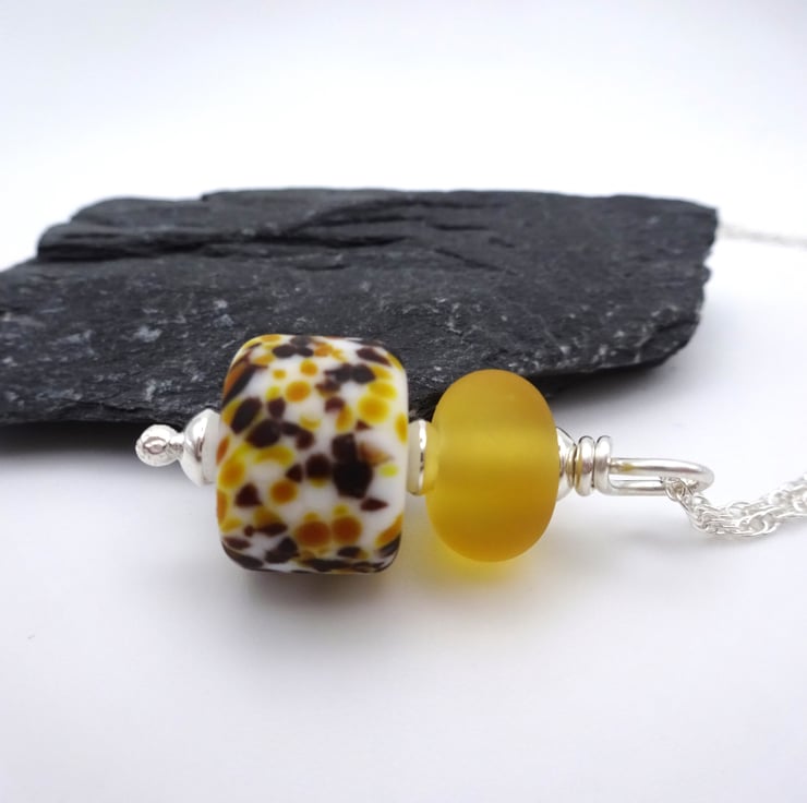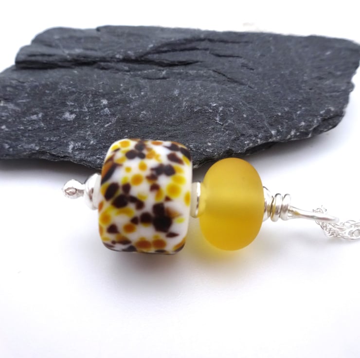 It features a handmade lampwork glass pendant strung onto a sterling silver chain.