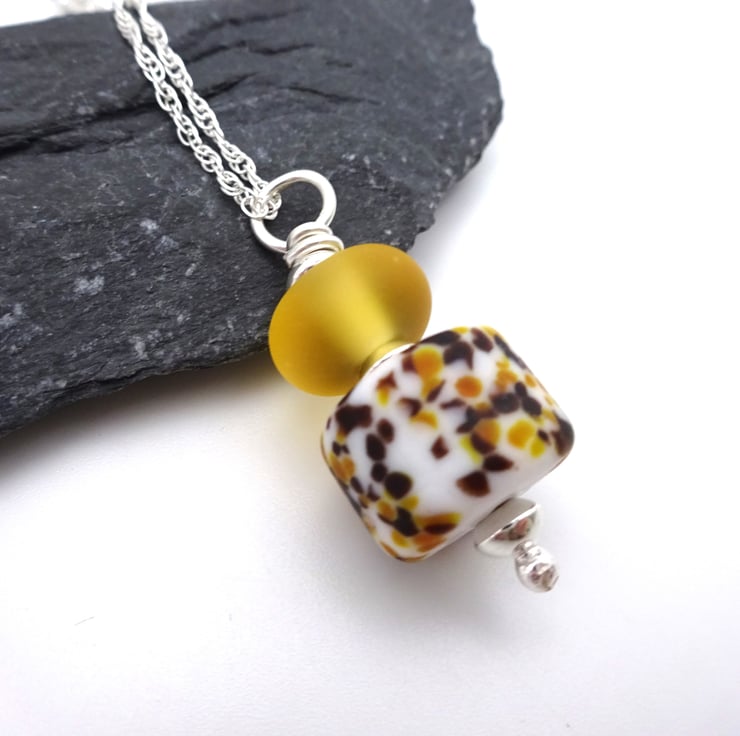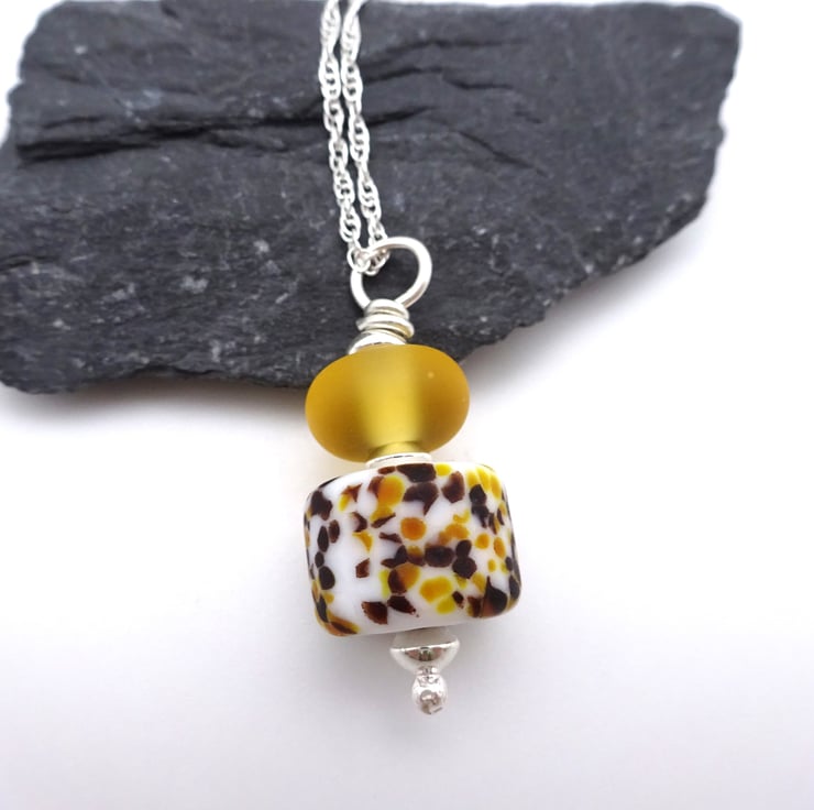 The glass pendant has been handmade by me using amber, brown and white glass.