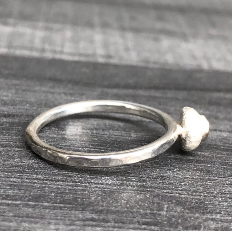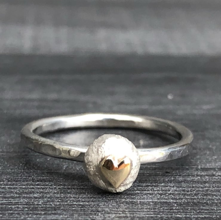 This Gold heart ring is hammered and has a matt, frosted pebble which features the 9ct gold heart. The hammered band measures approx: 2mm in width and the pebble approx: 6mm in diameter. Please don’t forget to let me know at Checkout or you can message me, the ring size you require. Also let me know whether you used a narrow ring sizer (approx: 4mm in width or a wide ring sizer (6mm in width) to size your finger. This ensures a perfect fit.