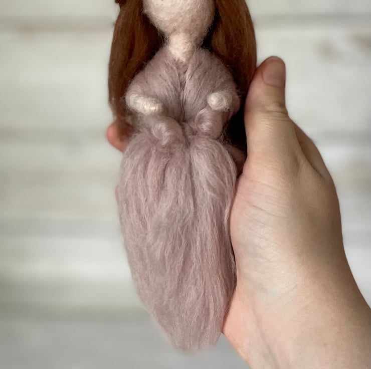 She is around 7 inches in height and has mid length brown hair. I handmade her dress using merino wool.