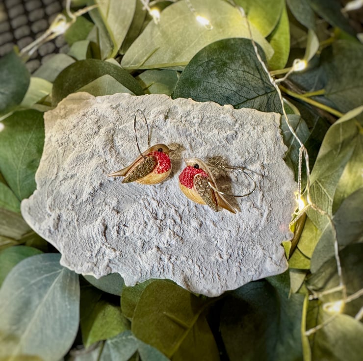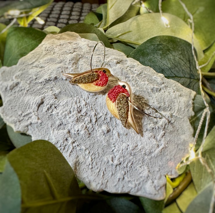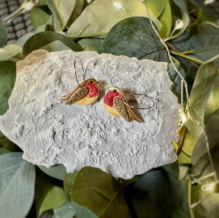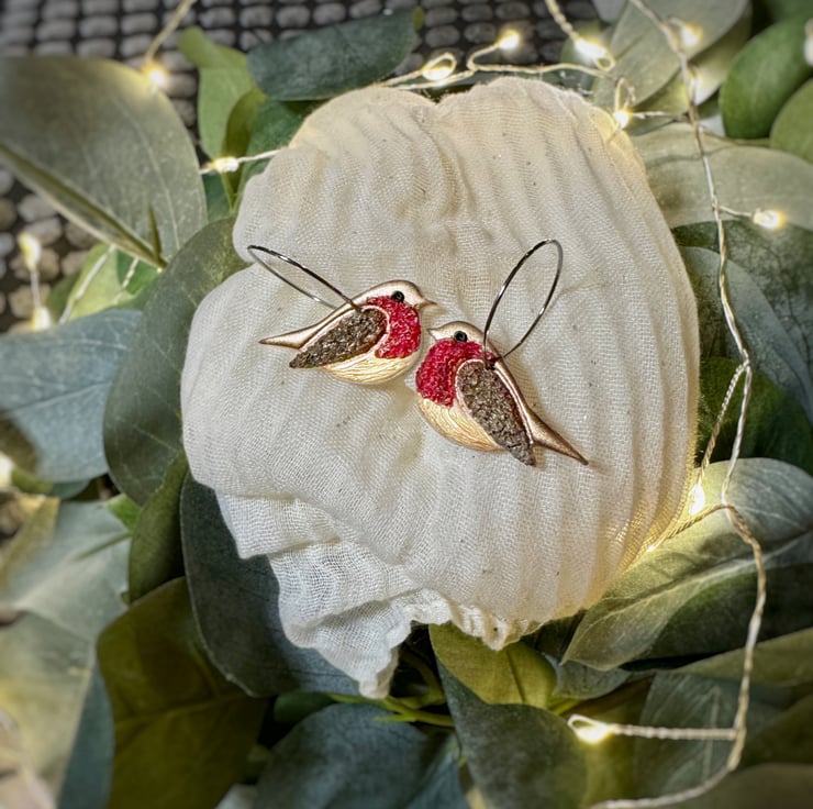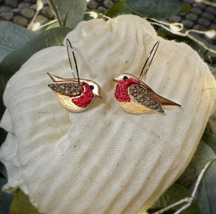The robins’ iconic red chests are textured, adding depth and dimension to their appearance. Suspended from hypoallergenic stainless steel hoops