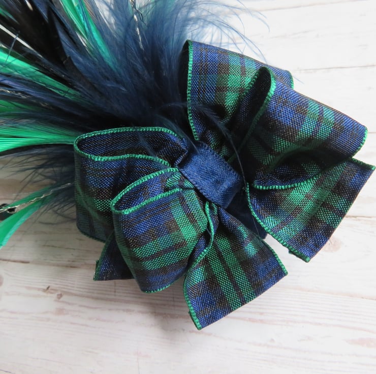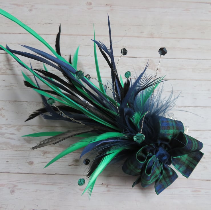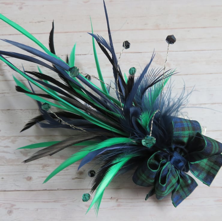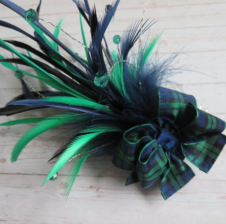 Navy Blue Emerald Green and Black Feather & Crystal Black Watch Tartan Bow Comb