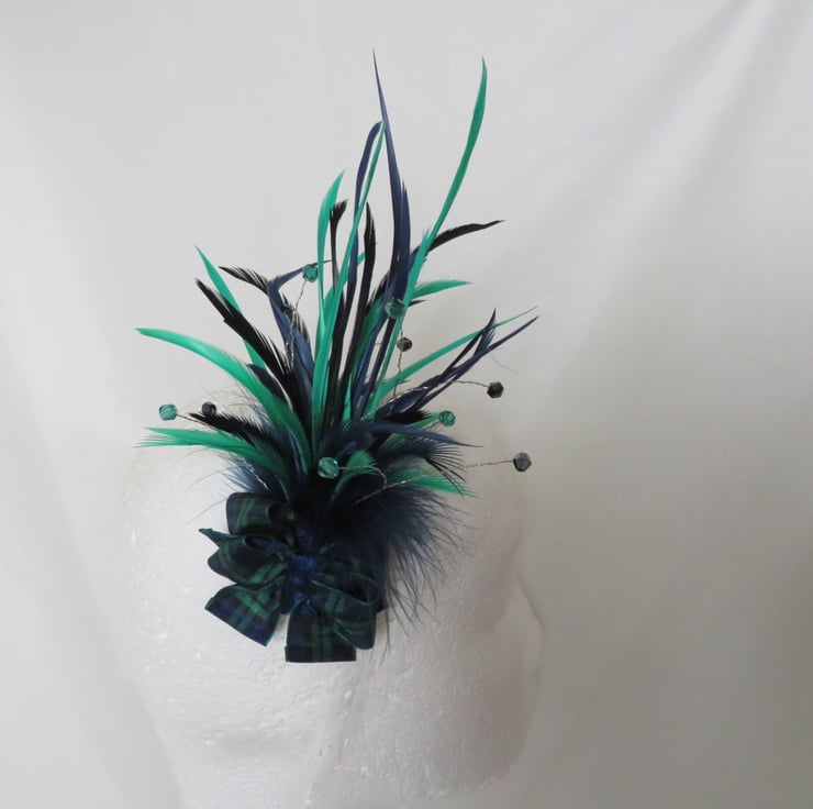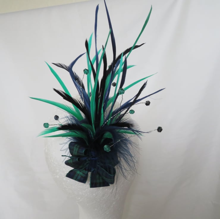 This 'Tartan Verity is an attractive and eye catching feather fascinator in emerald green, navy & black.