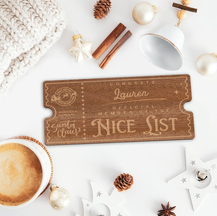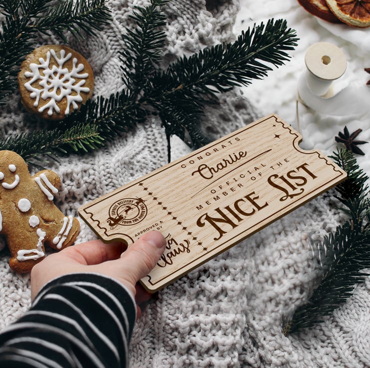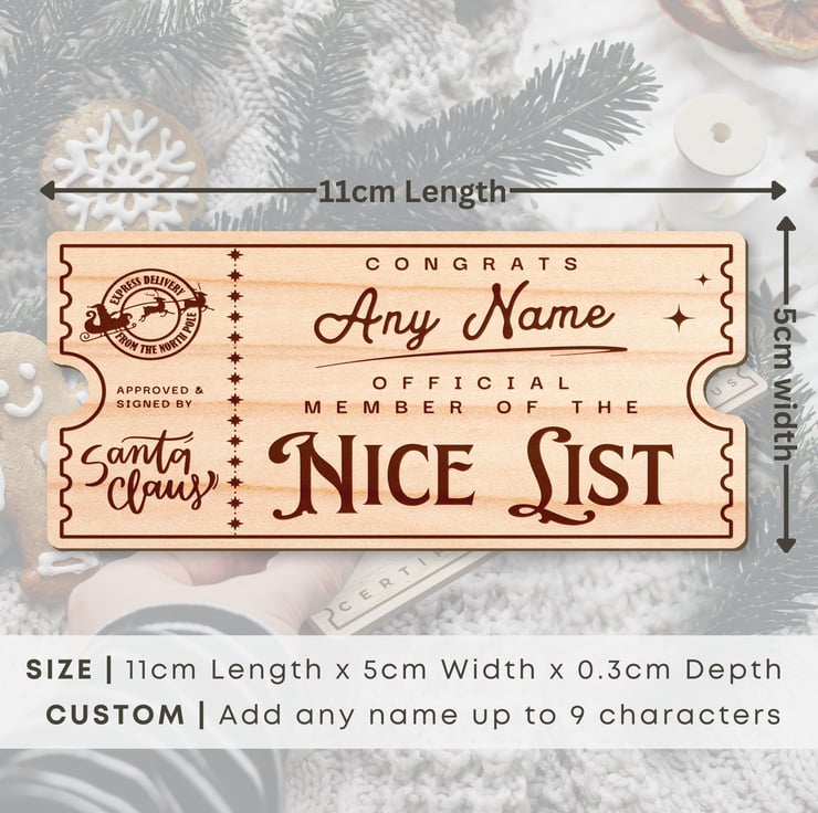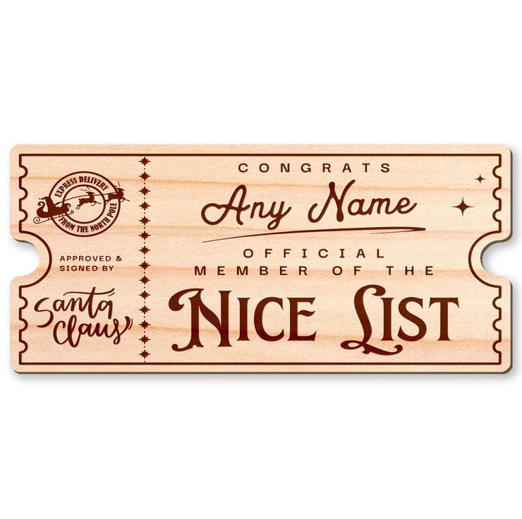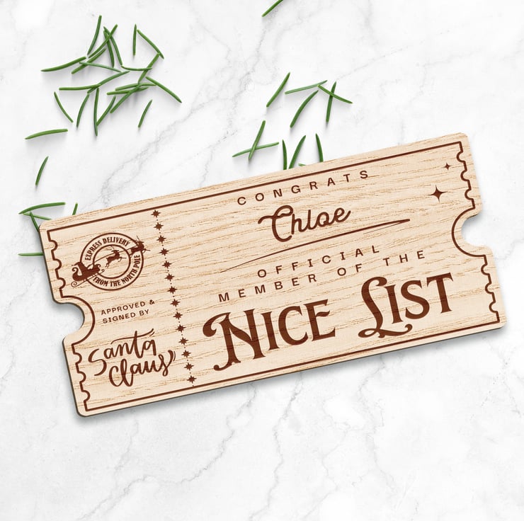 Celebrate the magic of Christmas with this beautifully crafted personalised wooden "Nice List" ticket!