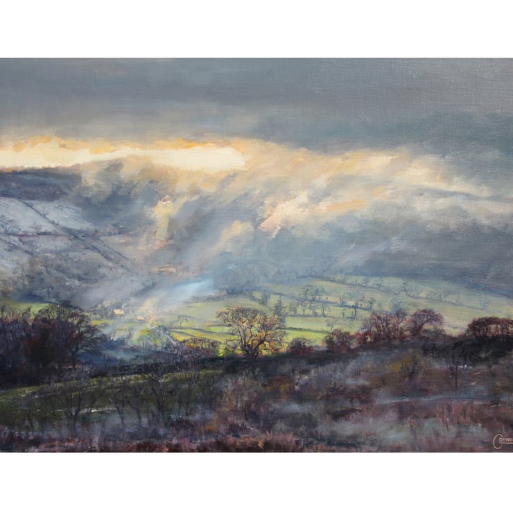 In this view down the valley, a momentary and improbable gap opens up through the clouds to admit this small but stunningly beautiful dose of low winter sun. The light catches the wet rooftop of this distant farmstead, reflecting the sun like a mirror.