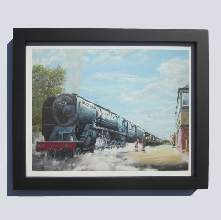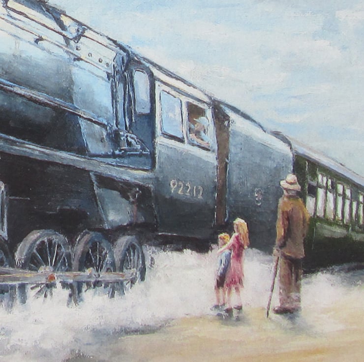 A grandfather calmly soaks up the nostalgic reminiscence of a lost era, while his grandchildren respond instinctively to the sudden release of steam around them, all rapt, and all in awe of this leviathan of the steam era. The locomotive in this painting (92212) is preserved by The Watercress Line Heritage Steam Railway and is depicted pulling out of their beautifully restored Alresford Station, Hampshire.