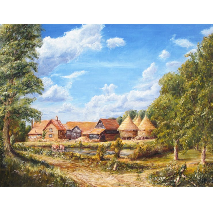 Cattle cool themselves in the pond, while air redolent with summer permeates the lazy stillness of this quintessential Home Counties farmyard.