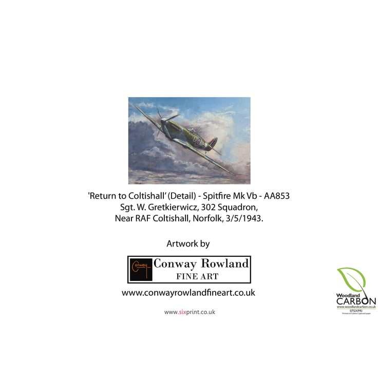 The painting depicts the Spitfire Mk Vb (AA853) of Sgt. Wladyslaw Gretkierewicz, 302 Squadron, being flown on the 3rd May 1943. The Squadron are shortly to arrive back at RAF Coltishall, having just crossed the Norfolk coastline, but they take off again very quickly, flying as part of the search and rescue mission for downed bomber crews over the North Sea.