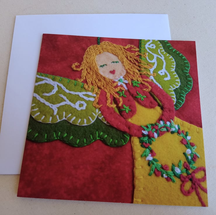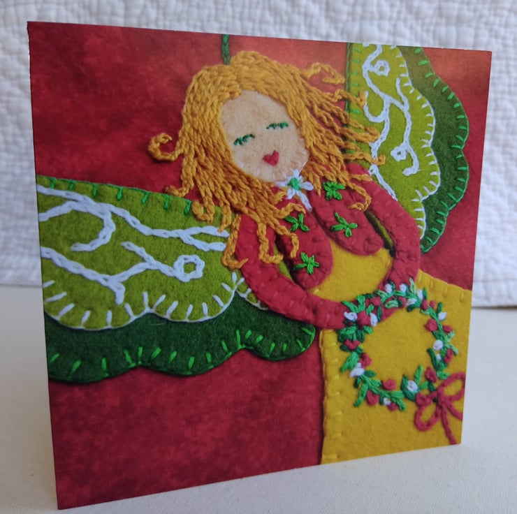 A stunning printed card reproduced from my own hand appliqued and embroidered fairy. Wearing a dress and bolero in festive colours and holding a poinsettia wreath, she would make a lovely Christmas card, but can be used for many other occasions too.