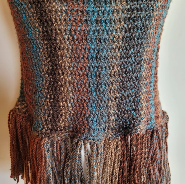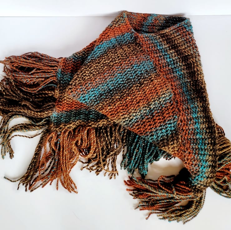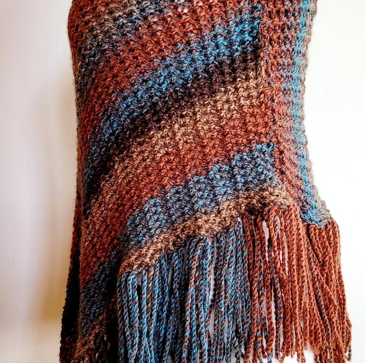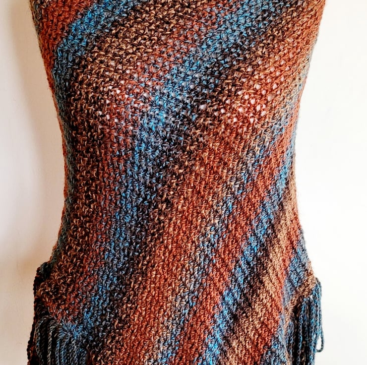 Embrace the changing seasons with our Brown and Blue Hand Knitted Striped Poncho, a perfect addition to your autumn wardrobe. Hand knitted over the course of a few evenings from a soft acrylic yarn, this poncho boasts a harmonious blend of brown, blue, bronze, and beige colours that create a striking visual appeal. The soft stripy design adds many elements of colour, making it easy to pair with any outfit.