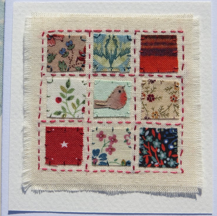 Pretty hand-stitched miniature 'patchwork' applique mounted onto greeting card. The pretty fabrics are chosen with care and the centre square has a tiny applique robin stitched onto it. Very fine and delicate work. My hand stitched cards are gifts in themselves to keep, as well as a card in which to write your message.