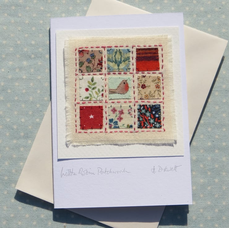 All my cards measure 12 x 9 cm and come with toning recycled paper envelopes in clear protective compostable sleeves - no plastic! Each card is signed on the front and my studio stamp is on the back. Cards are made from stout 100% recycled card - blank inside. The title is written below the textile: 'Little Robin Patchwork'.