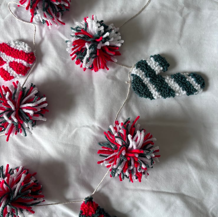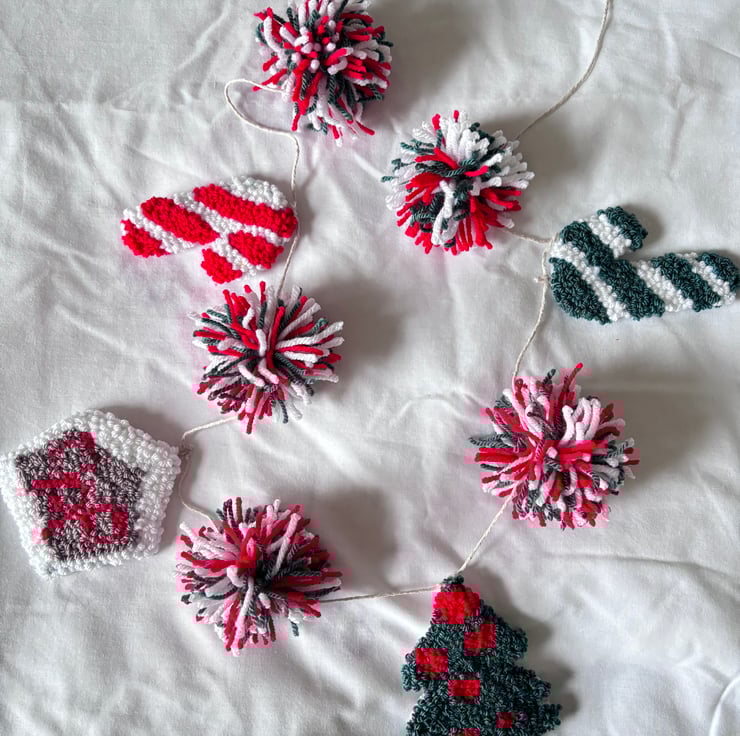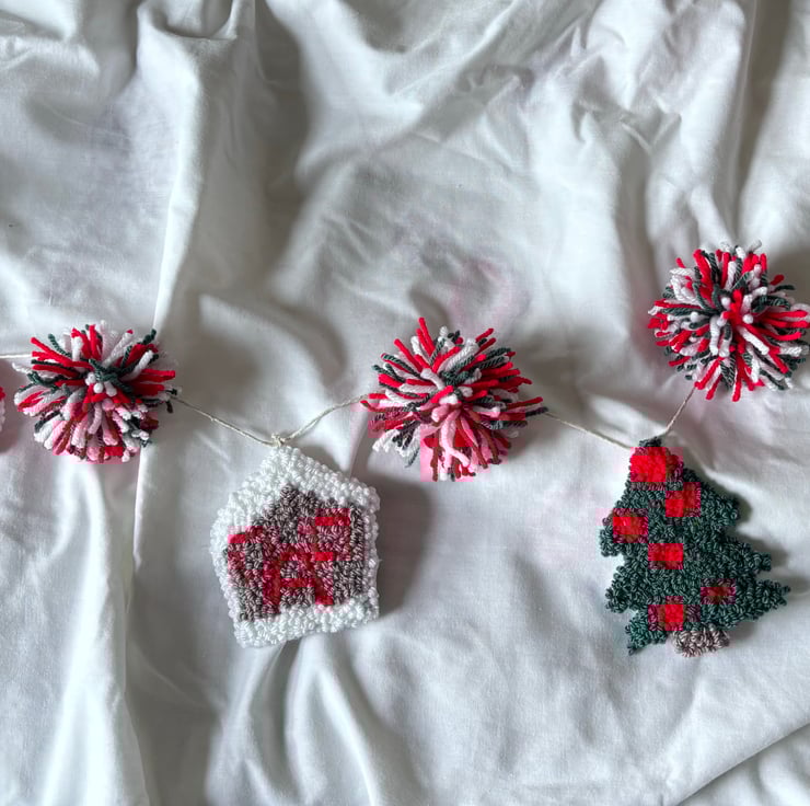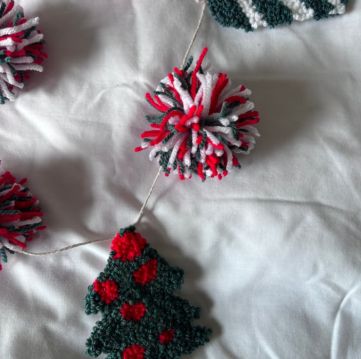 Handmade Christmas Garland, made with pom poms and punch needle decoration