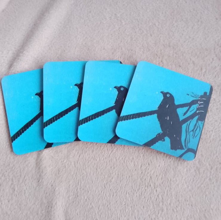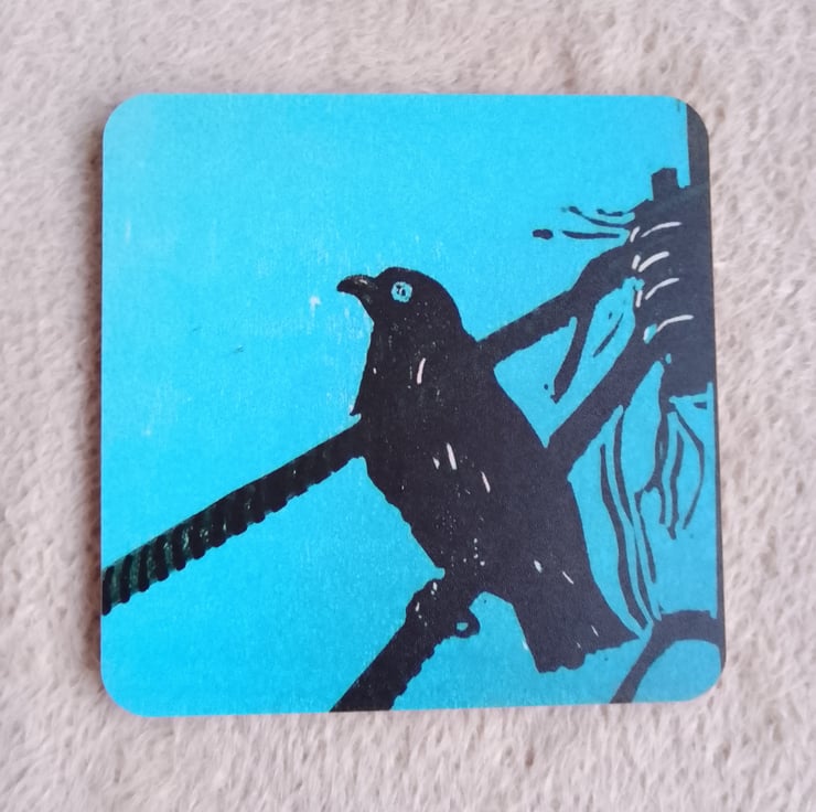 Coasters featuring a Jackdaw sitting on a wire. Made for me by a small print business using my original linoprints. They are 4 inches square and are printed on wood with a cork base and sealed with a heatproof finish. Wipe clean, will warp if soaked in water. Available singly or as a set of 4.