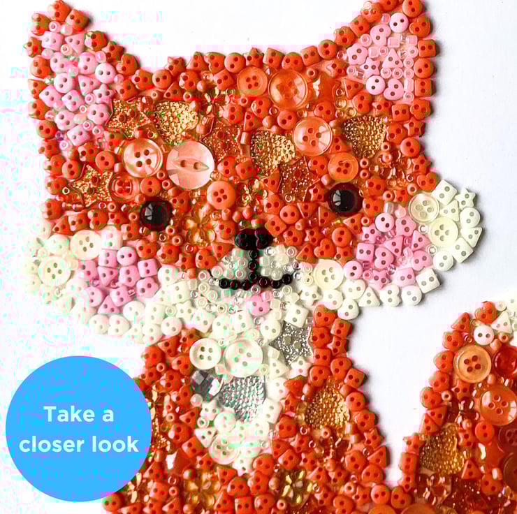 Lovingly handcrafted from buttons, flatbacks and mini beads. No two artworks are exactly the same.