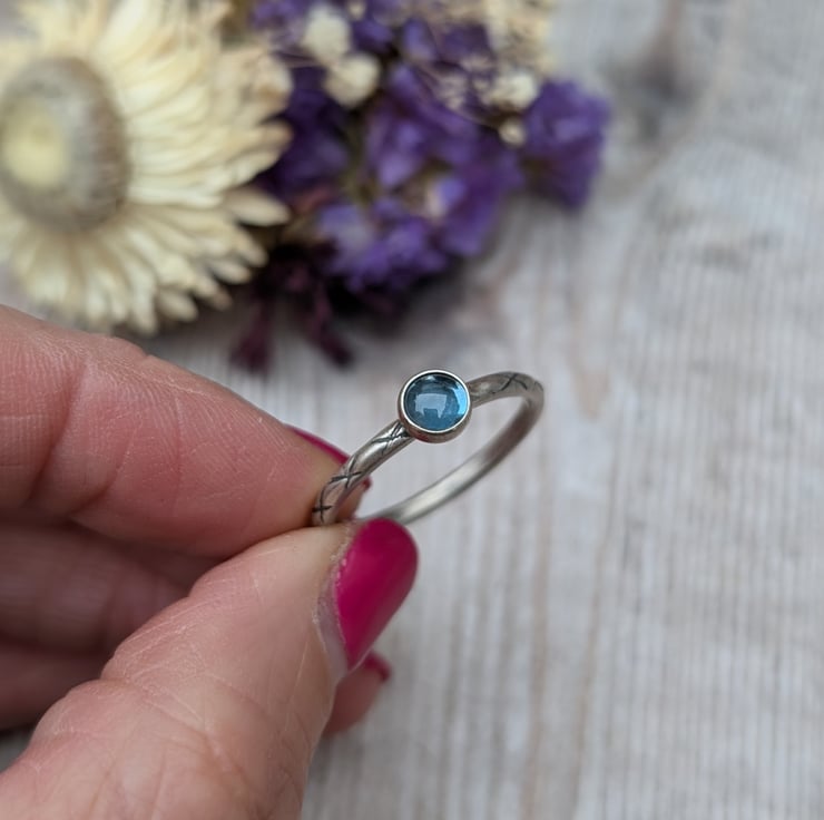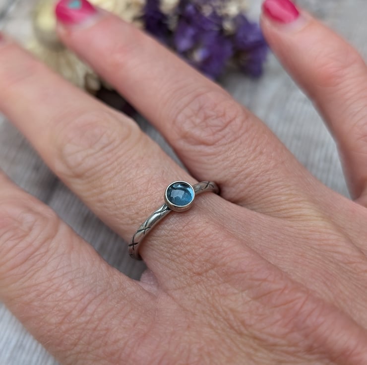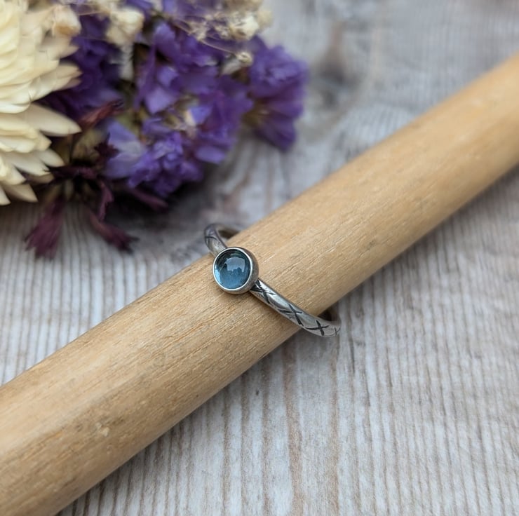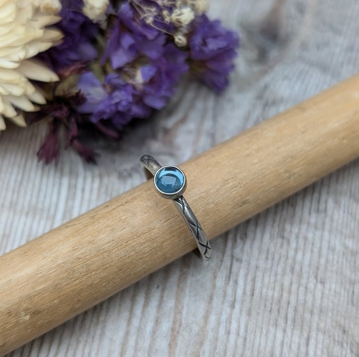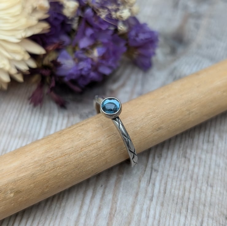 This elegant ring features a shimmering blue topaz gemstone, set in a recycled sterling silver band adorned with the intricate 'Starlight' pattern. The band has an oxidised finish, highlighting the hand-stamped design and adding depth to its texture. The faceted gemstone sparkles beautifully against the darkened silver, creating a striking contrast.