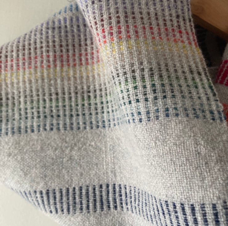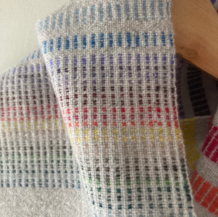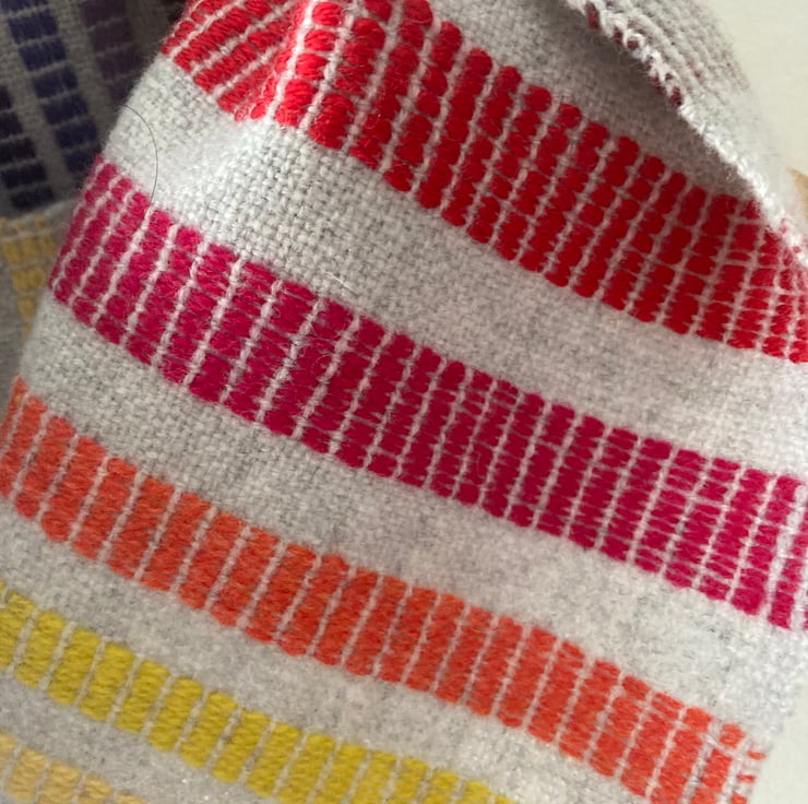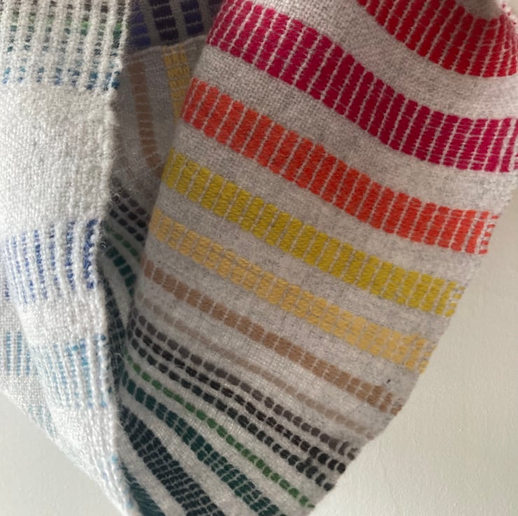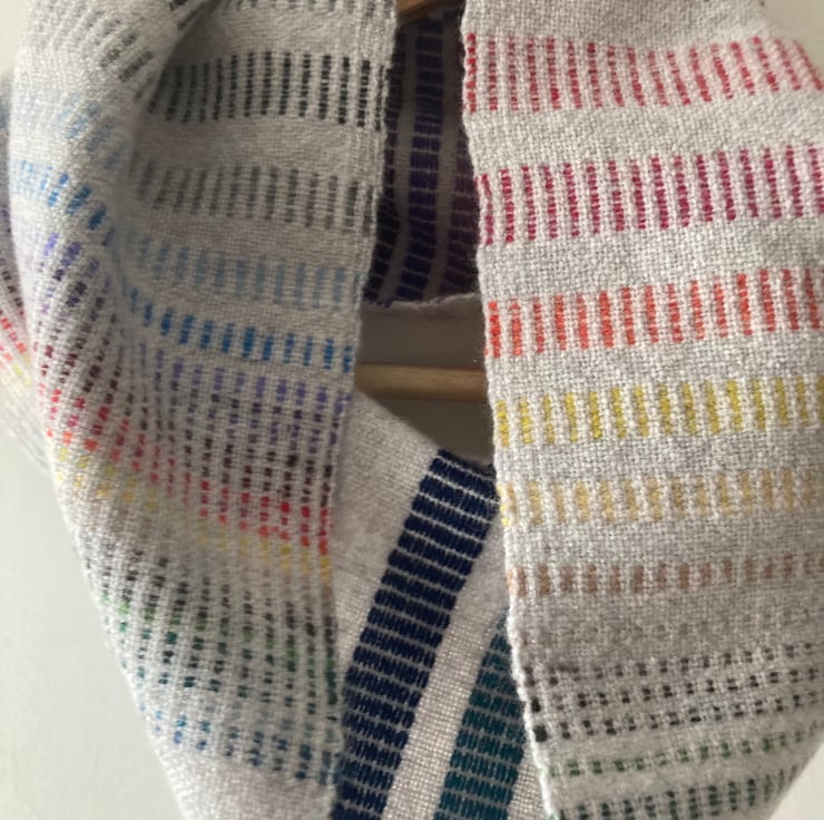 A super soft handwoven lambswool cowl in rainbow shades. Woven in a delicate summer and winter draft to create a double-sided cowl. One side is bold with Fibonacci blocks and the other side is subtle with tiny dashes of colour. The ends are joined seamlessly by needle weaving in the ends. The colours are repeated in warp and weft, blending to create every shade in between.