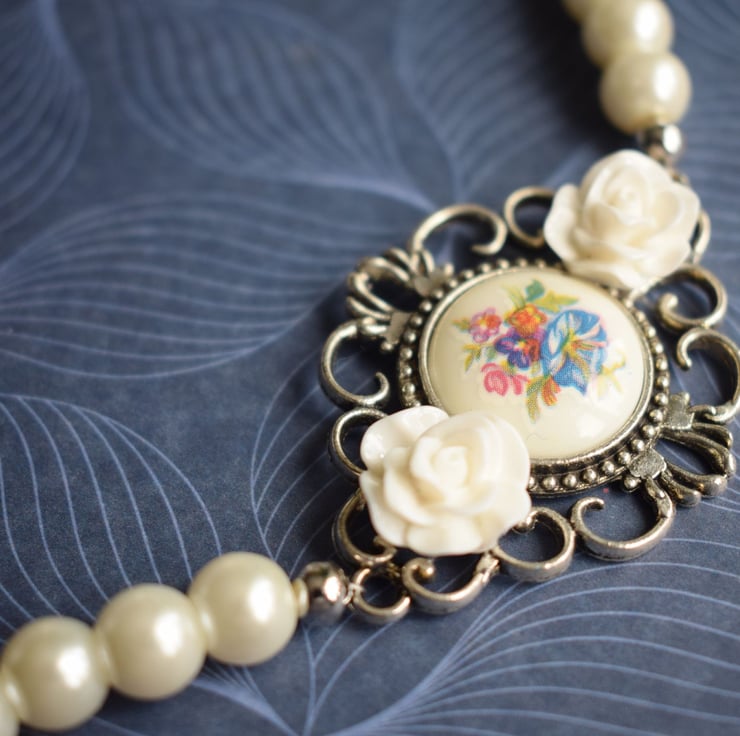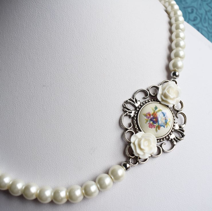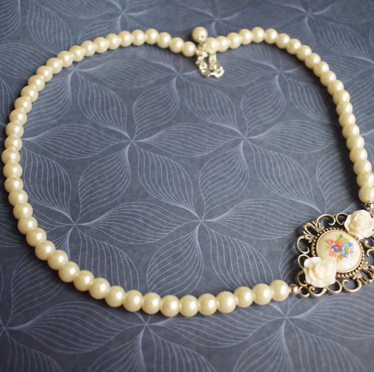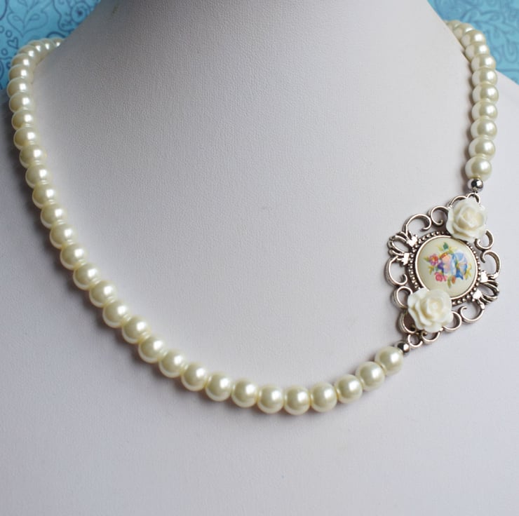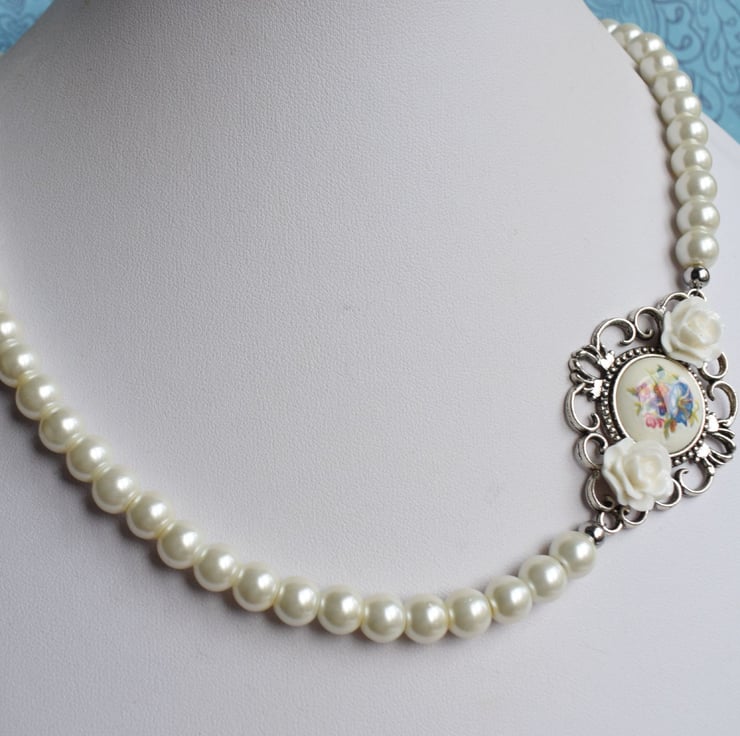 Made in an asymmetric style this necklace has glass pearls all around and on one side has a little connector set with a vintage flower cabochon and finished with 2 little acrylic white rose cabochons. It fastens with a lobster claw clasp and has an extender chain so can be worn from just over 20" to 23".