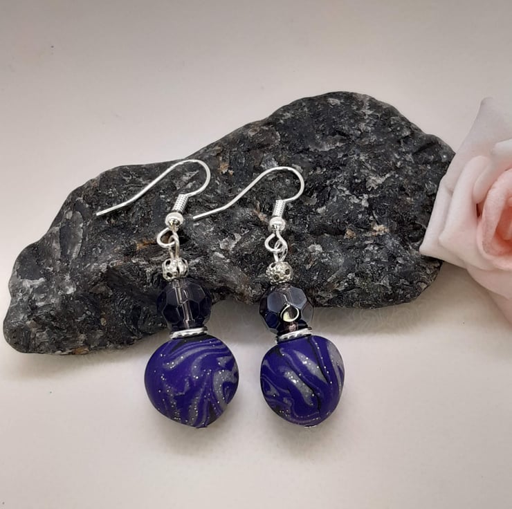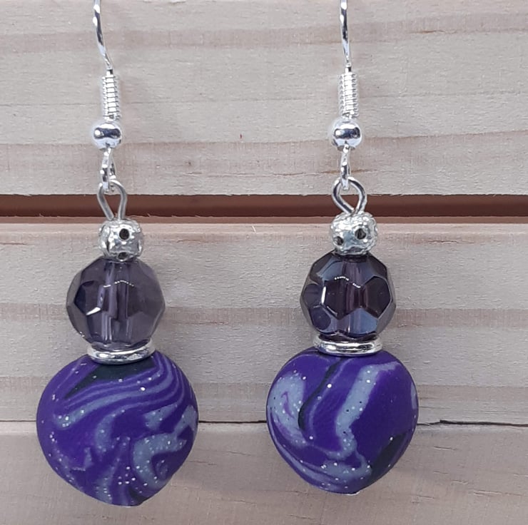Polymer clay dangly earrings in a purple and silver unique swirl design with a touch of sparkle