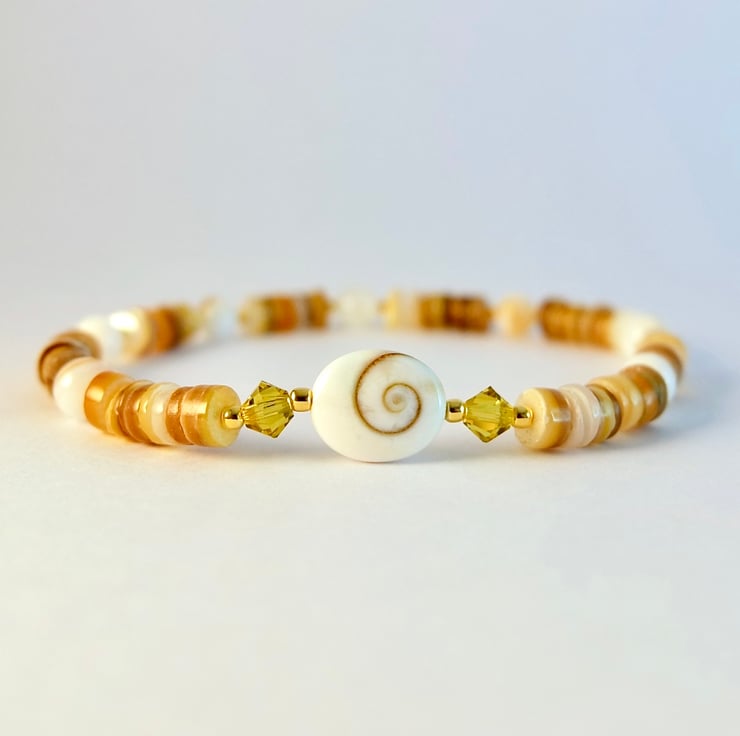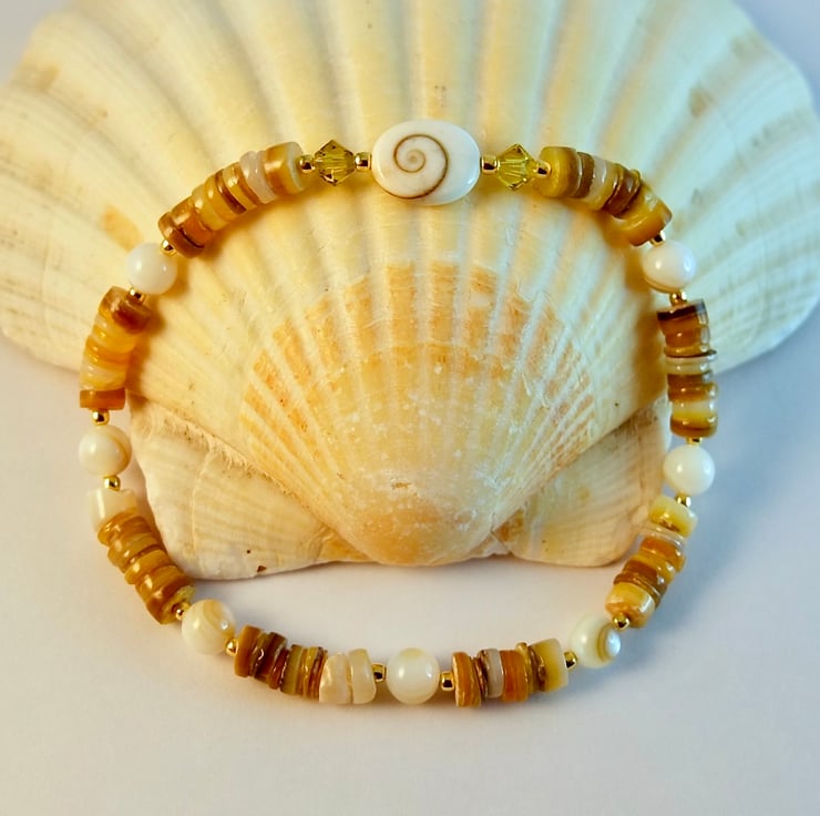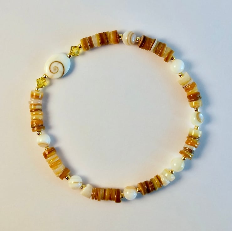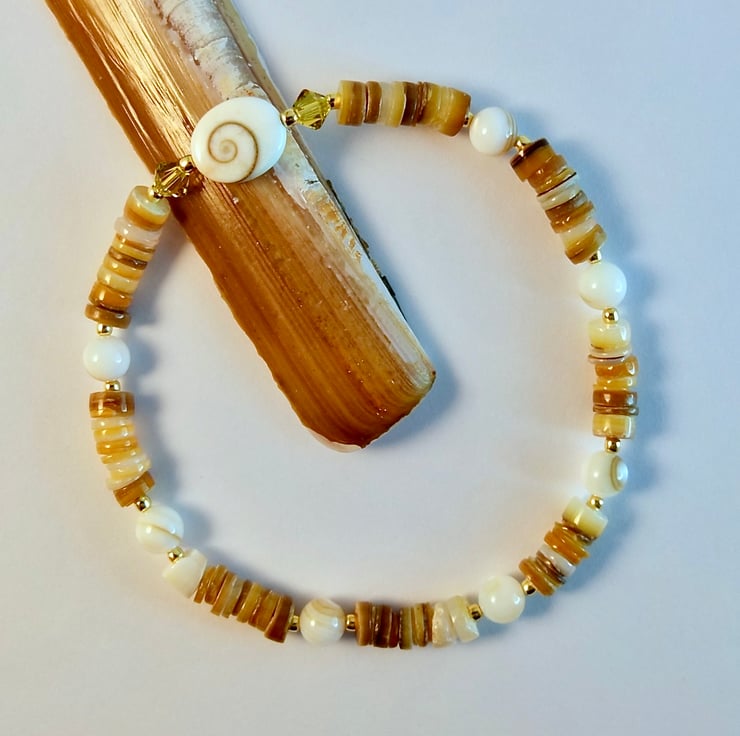 This dainty, natural shell bracelet is in shades of ivory, gold, cream and golden brown.