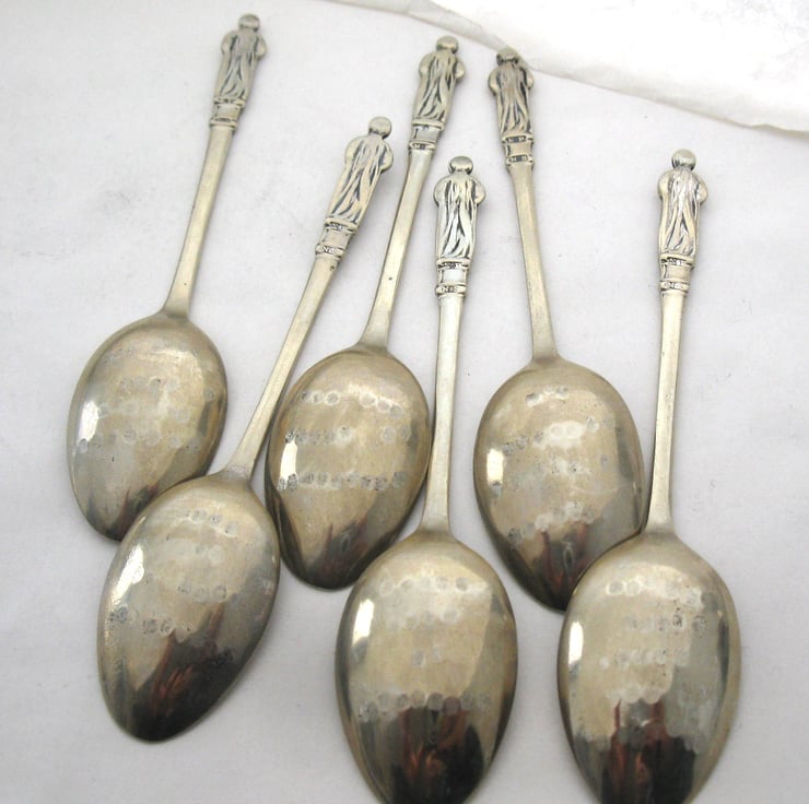 Please note: These are vintage items that have been pre-owned. The spoons have been used, polished, loved and polished some more, so the plating on all of them is... well let's face it, it's gone. You will receive the six spoons shown in the photos. Please therefore study the photos with care if signs of age and wear bother you.