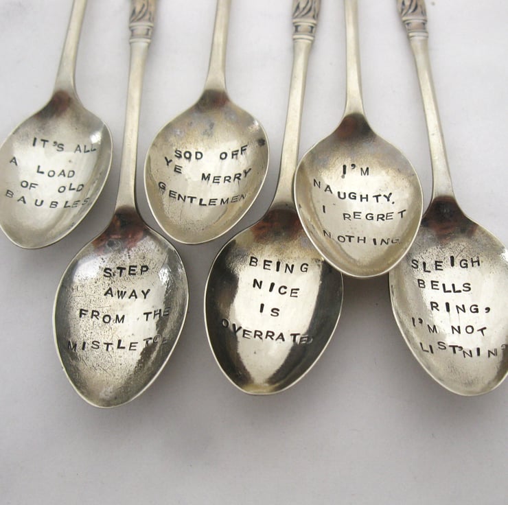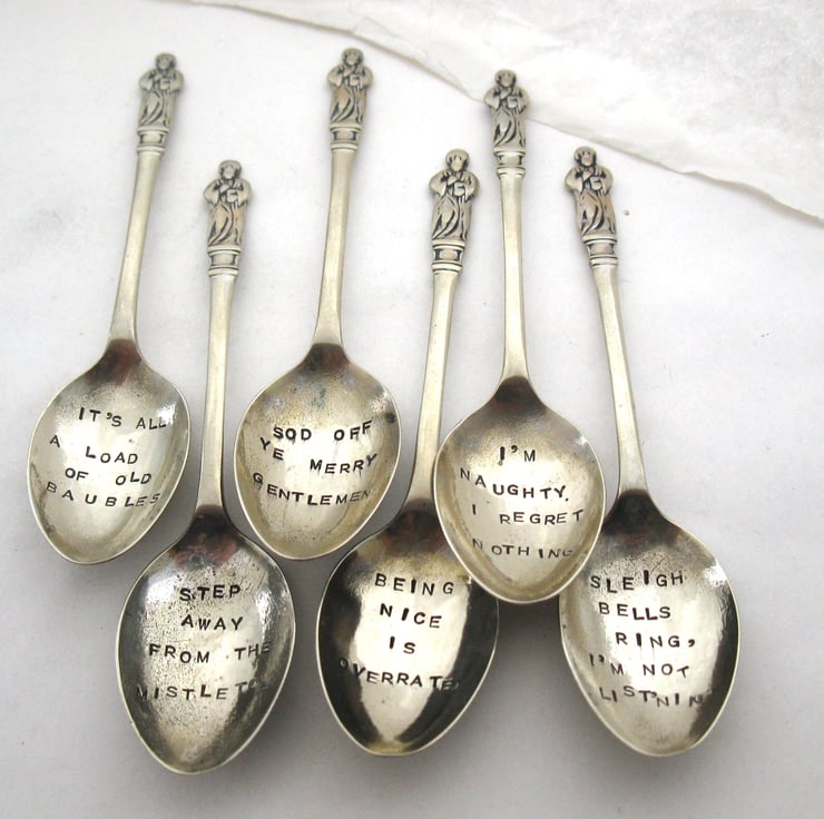 Yet more of my popular vintage silver-plated (or in this case, formerly silver-plated) vintage 'apostle' coffee spoons, each handstamped with a grumpy un-festive message. They are great small gifts for anyone who doesn't really like festive cheer, would rather be naughty than nice and would never, ever be caught standing under the mistletoe!