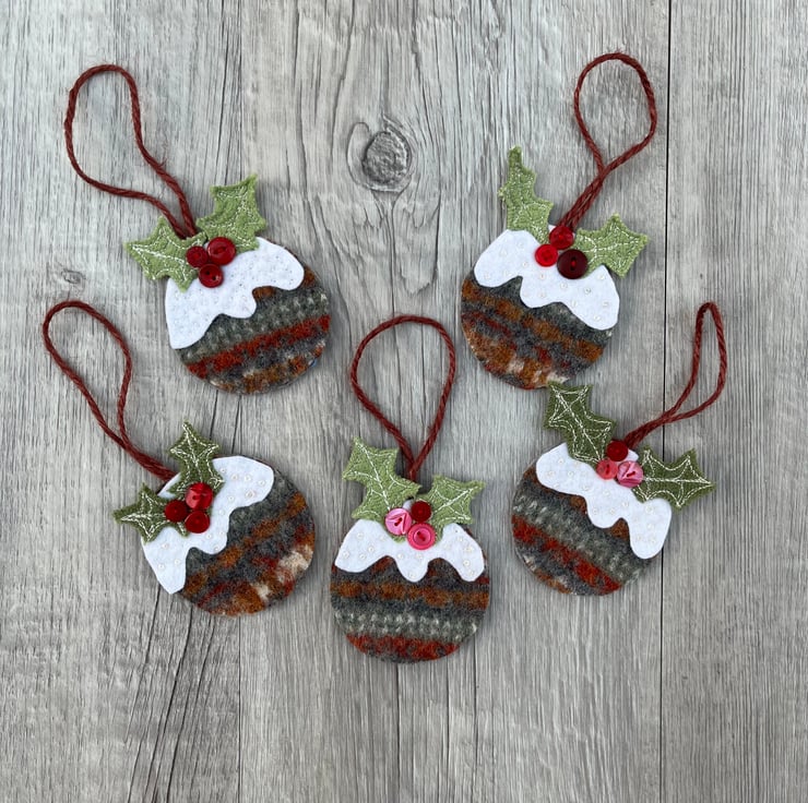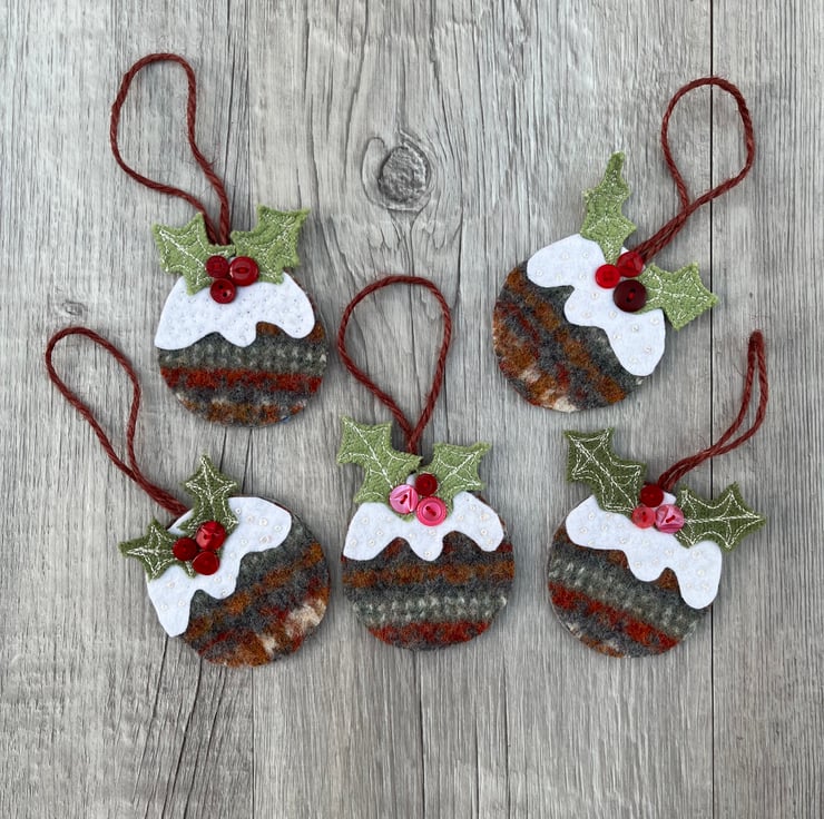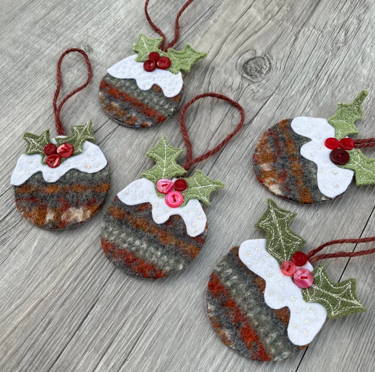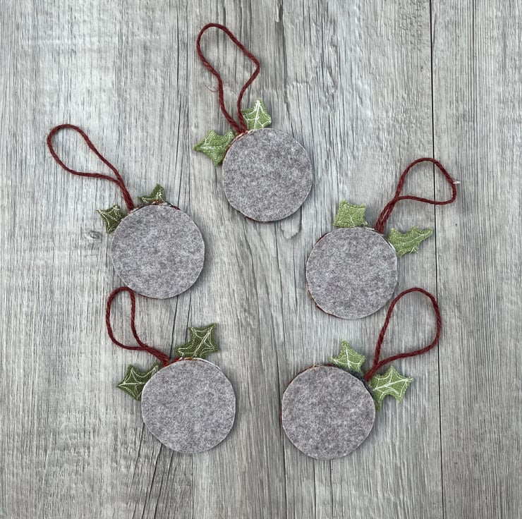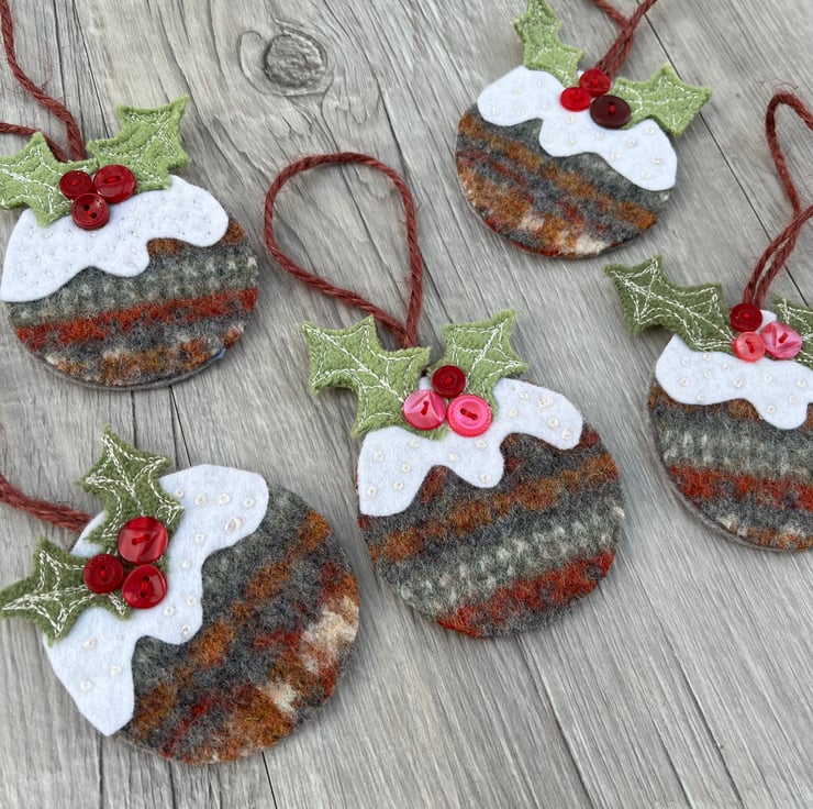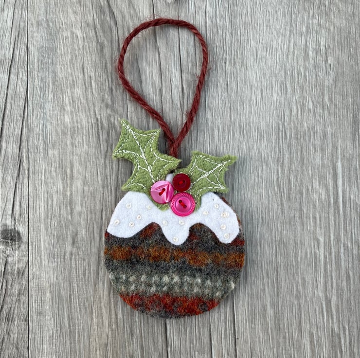 Made of repurposed felted wool with a white felt topping, it has hand stitched, mismatched repurposed red button berries, hand dyed wool blanket free motion embroidered holly leaves and a twine loop to hang. A felt circle is on the back and there's hand embroidered detail on the white felt.