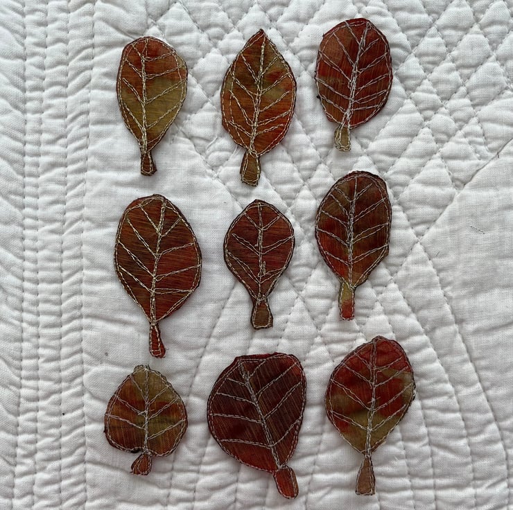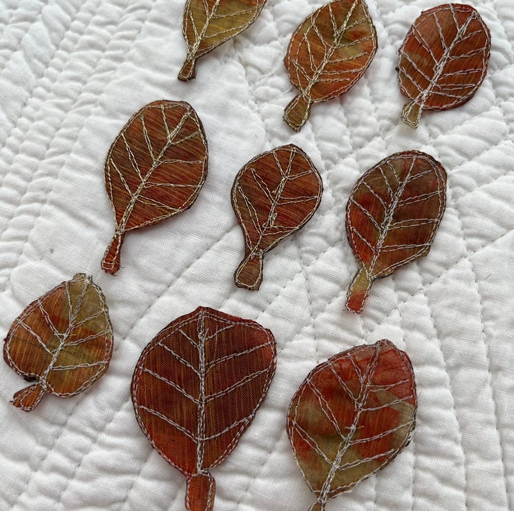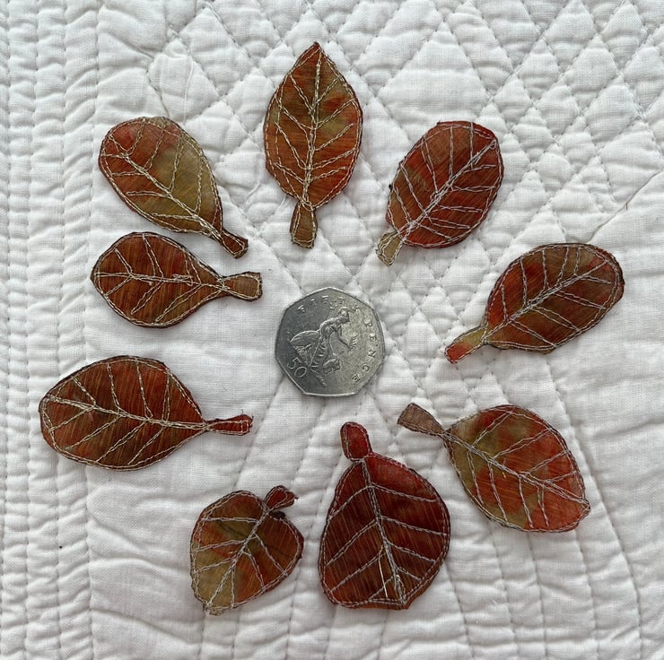 This pack of leaf embellishments have been made by using free motion embroidery techniques - drawing with the sewing machine. Each one is slightly different from another, giving them a quirky and organic look. They are embroidered in gold metallic thread.