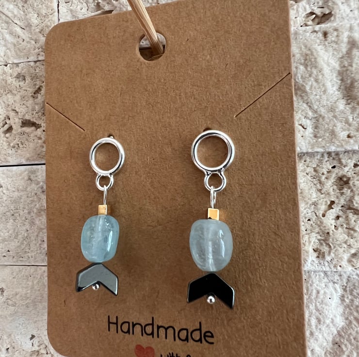 These drop stud sterling silver earrings showcase the serene beauty of aquamarine paired with bold sophistication of hematite.