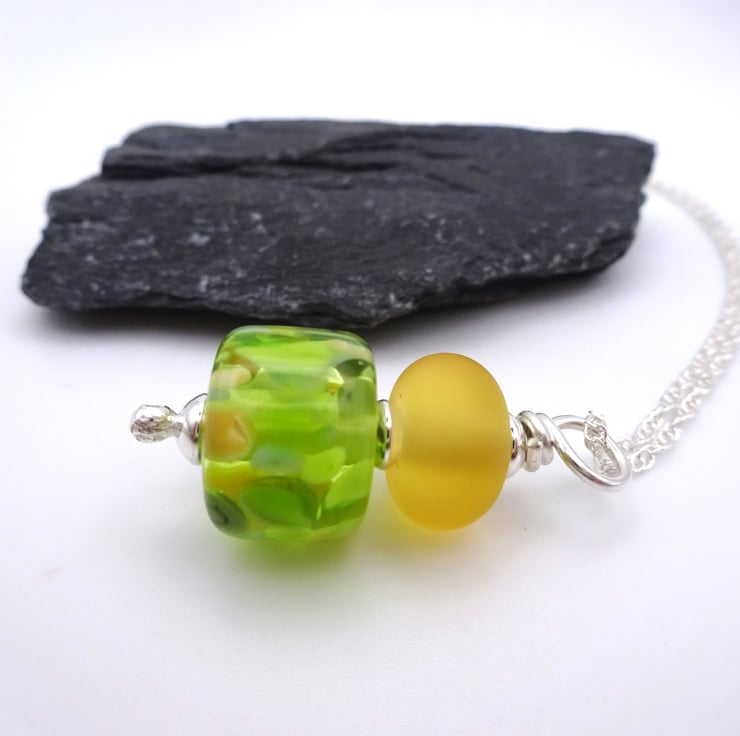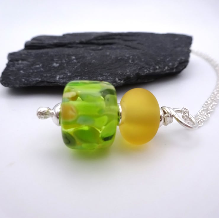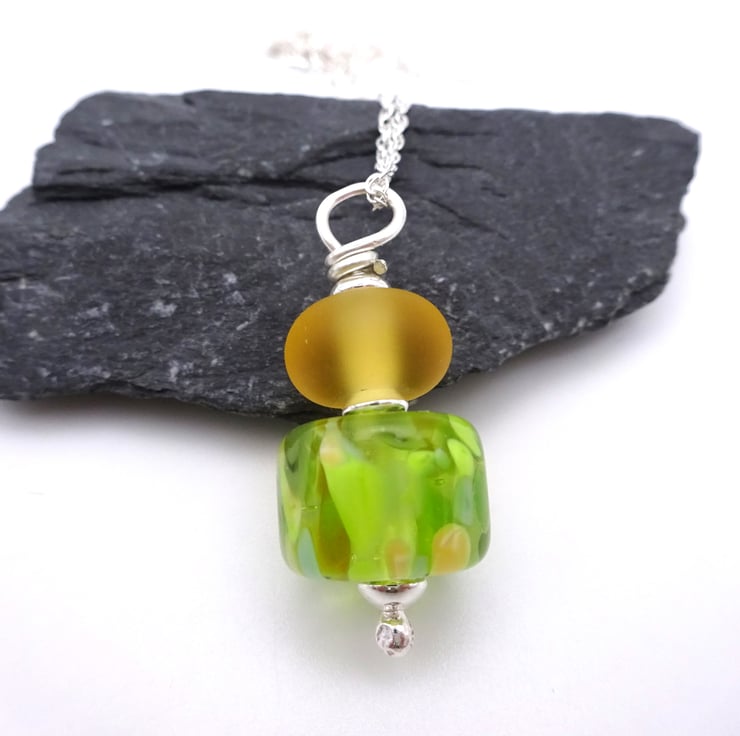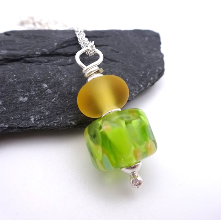 It features a handmade lampwork glass pendant strung onto a sterling silver chain.
