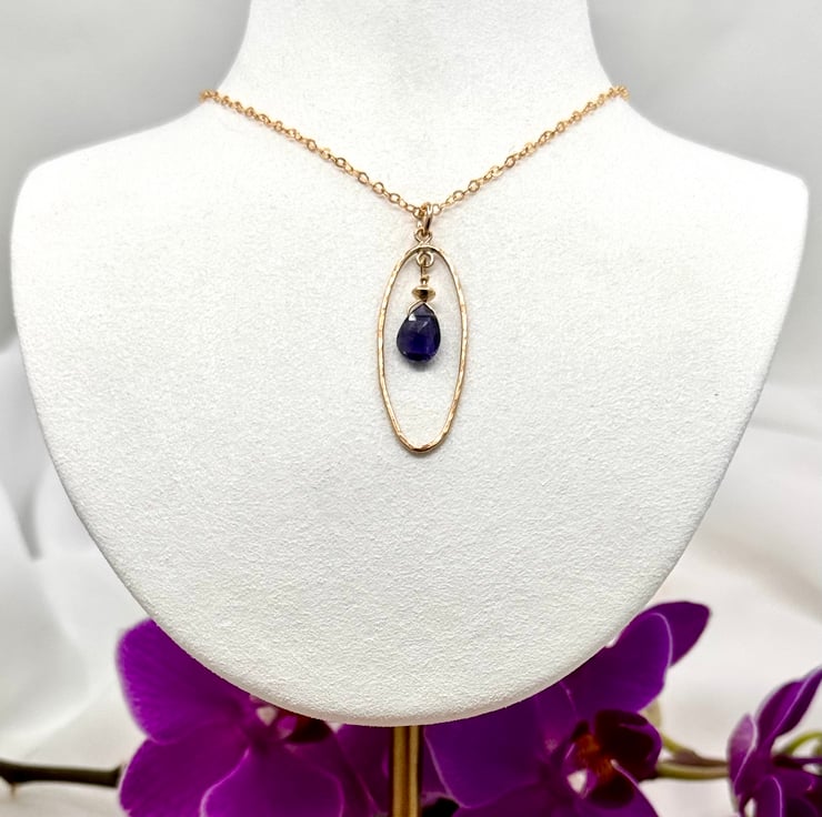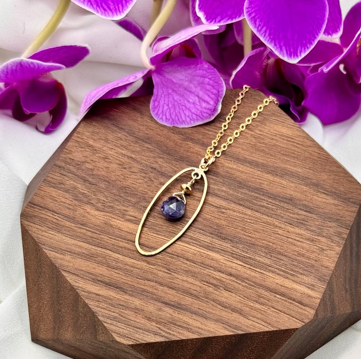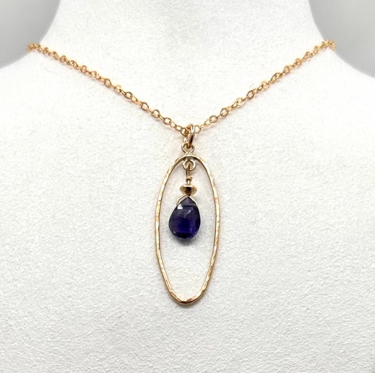 Gold filled wire and chain. 8mm x 6mm faceted Iolite briolette semi precious gemstone