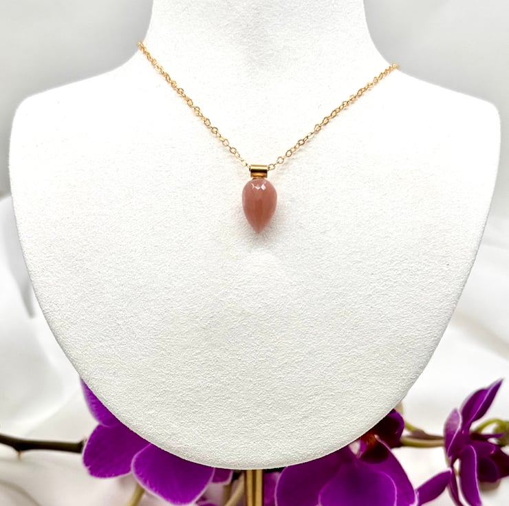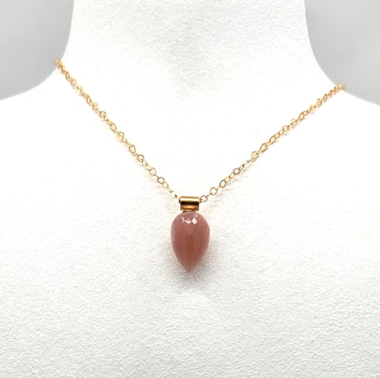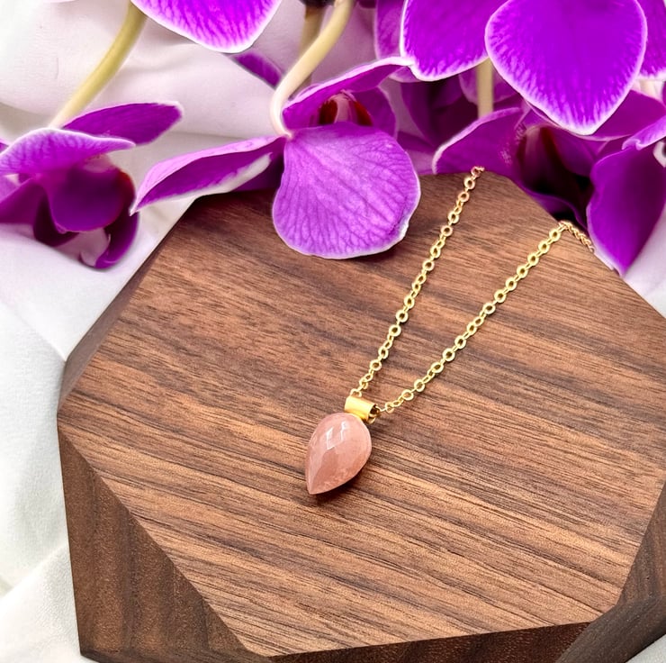 Gold filled wire and chain. 13mm x 9mm micro-faceted peach moonstone teardrop semi precious gemstone