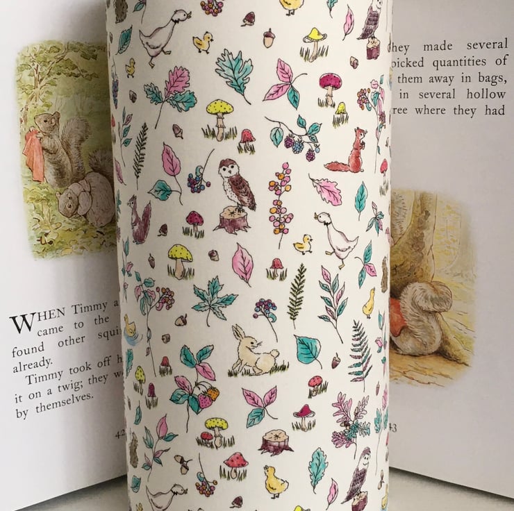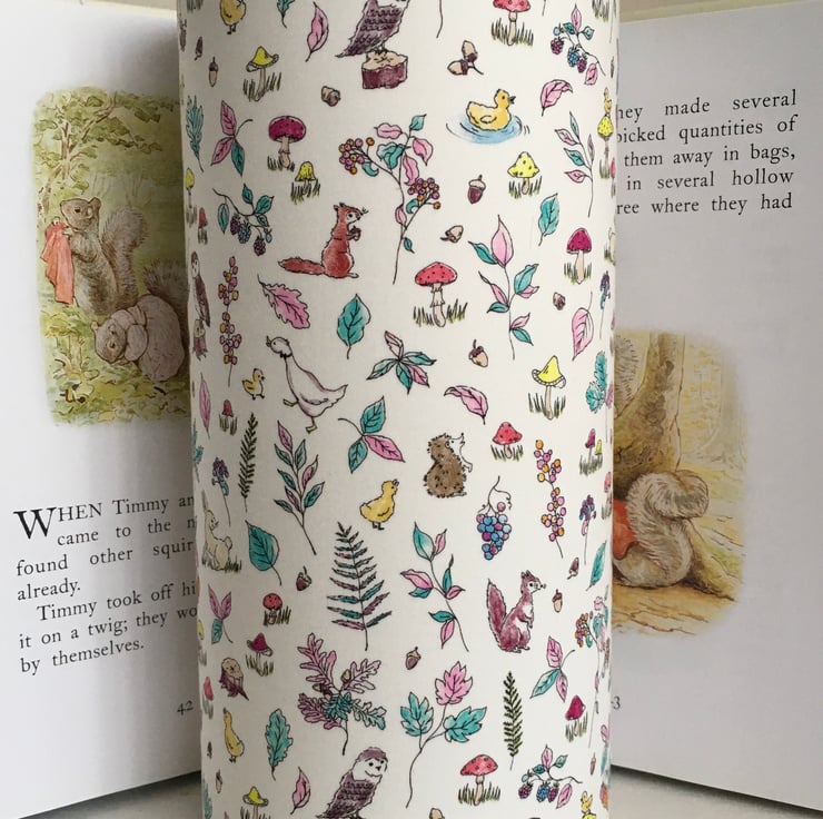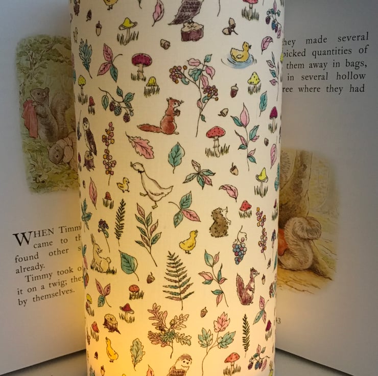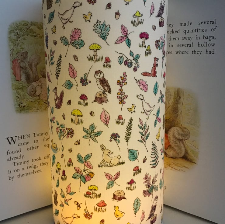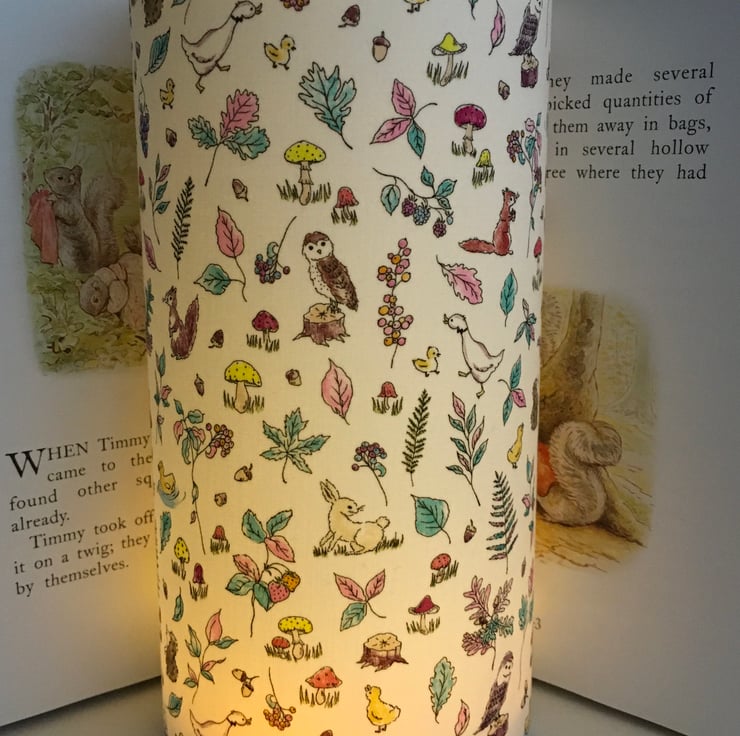 Such a delightful Liberty Print featuring a variety of creatures, frolicking among the Autumn leaves, mushrooms berries and acorns, on a soft white cotton fabric. Night Light looks simply lovely lit up.