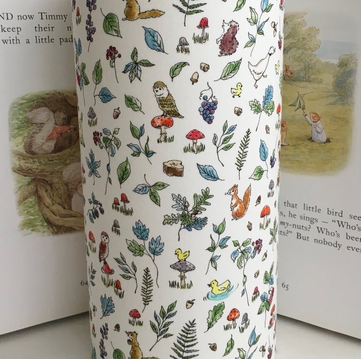 Such a delightful Liberty Print featuring a variety of creatures, frolicking among the Autumn leaves, Mushrooms, Berries and Acorns, Night Light looks simply lovely lit up. Gives a lovely cosy glow. Lovely gift for Children.