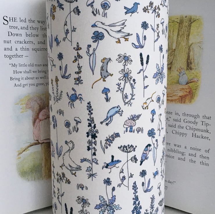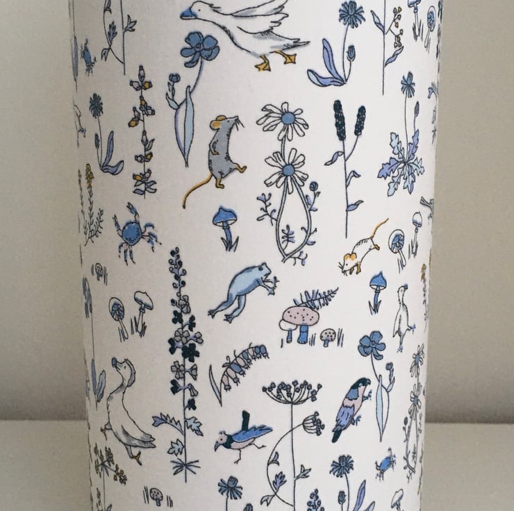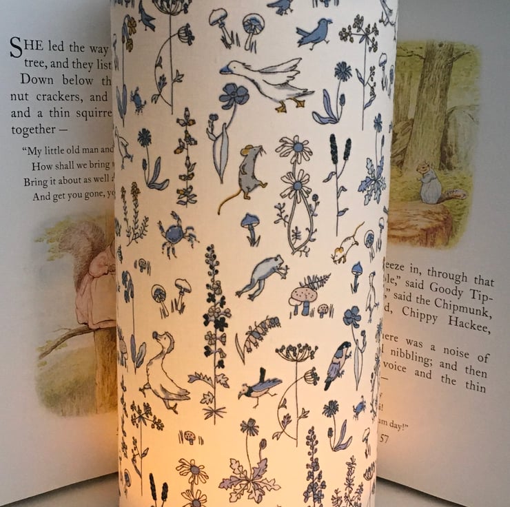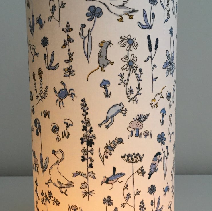 Theo is a hand- drawn conversational print. Inspired by Lewis Carroll's beloved classic Alice's Adventures in Wonderland. The design incorporates colourful creatures running pell-mell around the fabric as if part of a caucus race. Night Light Looks simply lovely lit up.