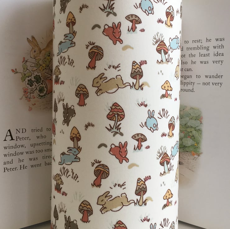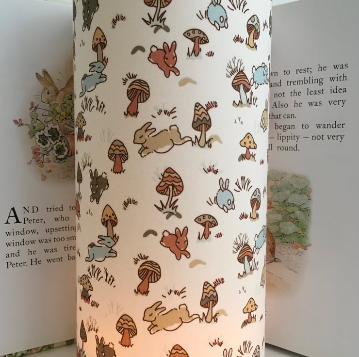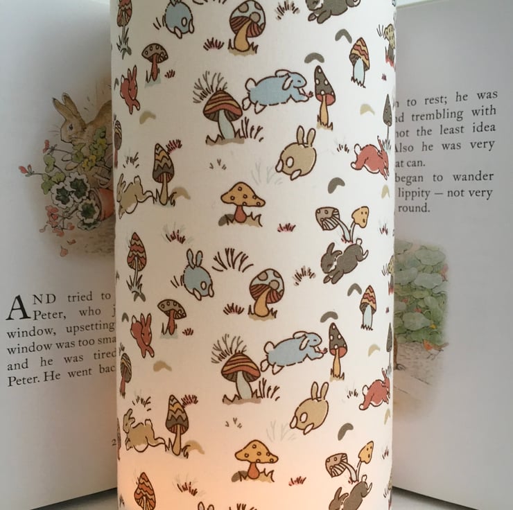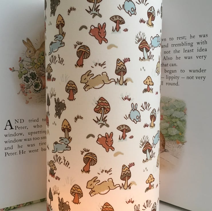 Such a delightful Liberty Print featuring Bunnies Hopping and Skipping on a soft cream cotton fabric, Simply lovely for a Babies Nursery. Night Light looks simply lovely lit up.