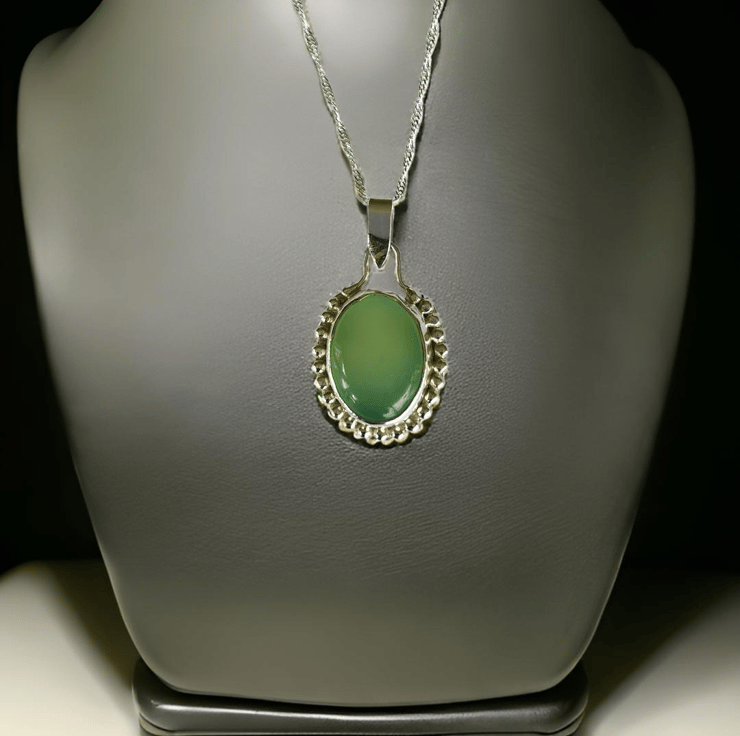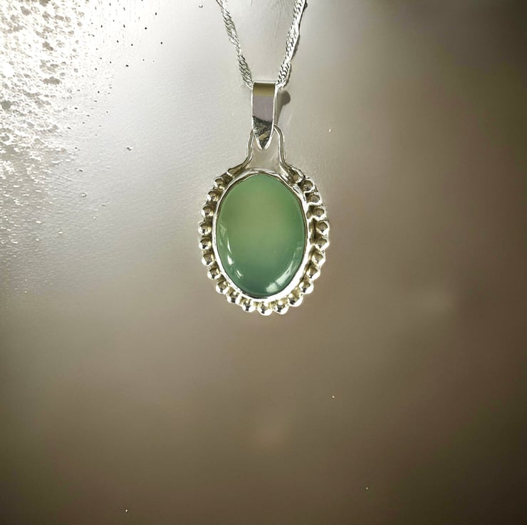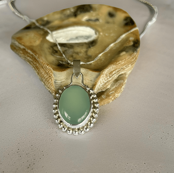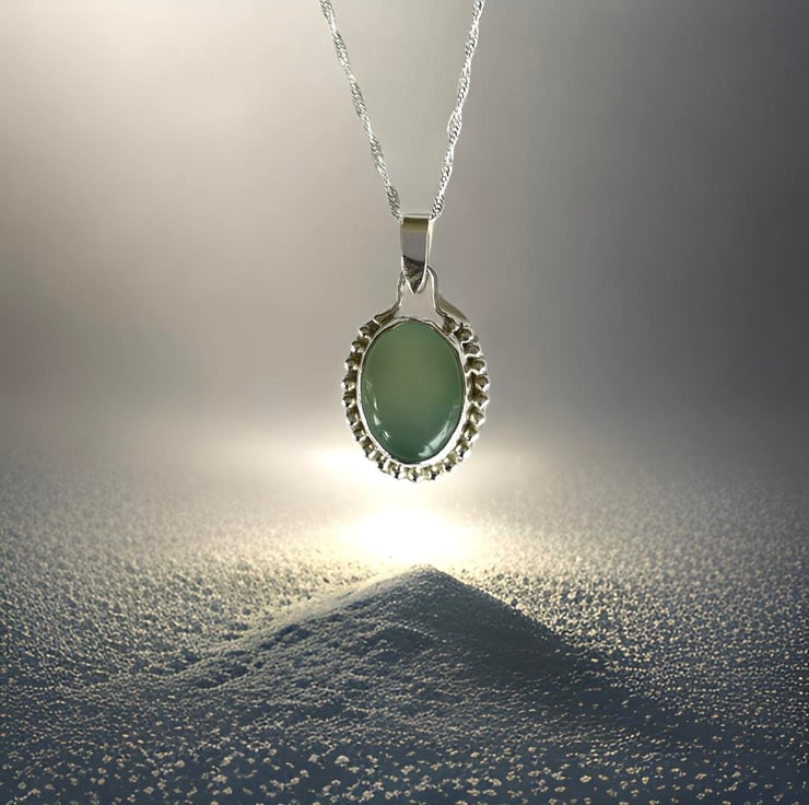 A delicate Chalcedony Gemstone Necklace, a truly exquisite piece handcrafted in Woolacombe North Devon. featuring a stunning 25mm Chalcedony aqua green gemstone surrounded by intricate sterling silver granulation, the pendant measures 30mm in length and 20mm wide offering a timeless and elegant design. Every gemstone varies in colours. Handmade to order with sustainable, recycled sterling silver chain. Perfect for any occasion, this necklace makes a perfect gift or a special treat.