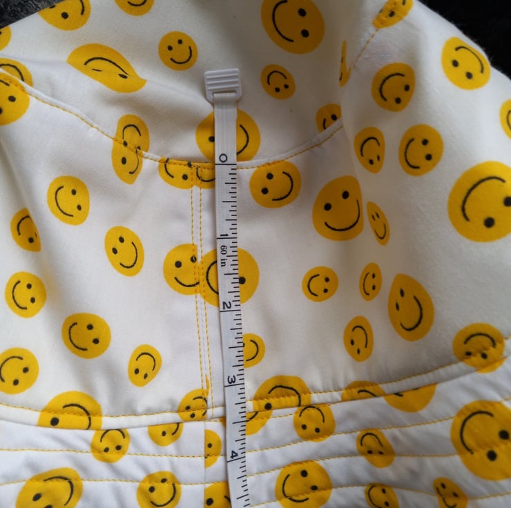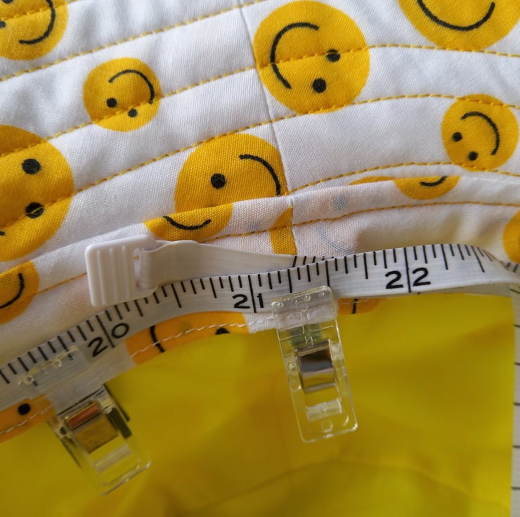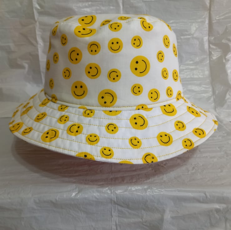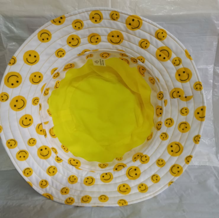 The outer hat and brim are made of a polycotton fabric, in white with yellow smiley face emojis.