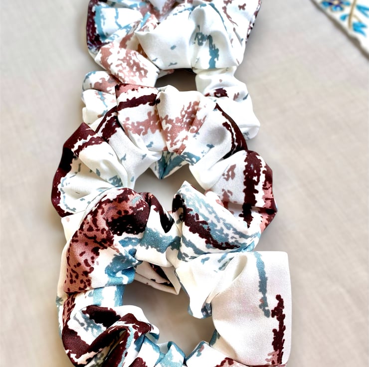 This stunning scrunchie features mix of cream with earthy brown and hints of blue, nature-inspired vibe, adding a subtle yet striking statement to your look. It’s perfect for elevating everyday hairstyles with a touch of artistic flair.