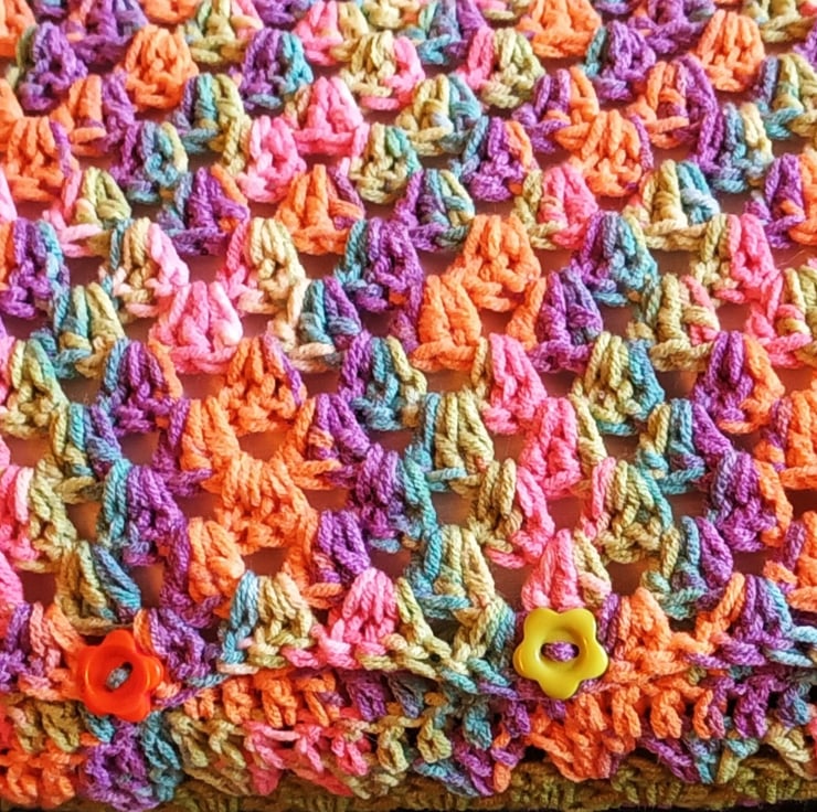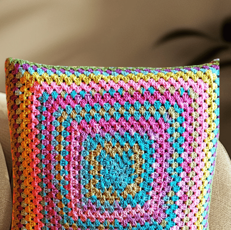 Give your sofa a lift with this colourful double-sided granny square cushion cover (pad not included). It fastens at the bottom with come cute flower buttons. It is crocheted in a beautiful cotton blend yarn for softness, colour retention and ease of wash.