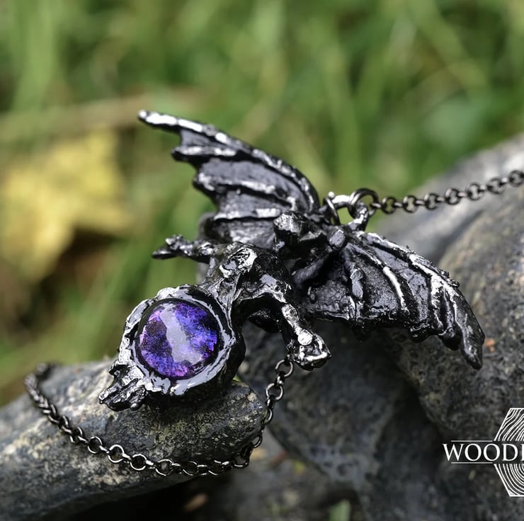 This is based on the Eye of the Witch, with a purple-hue hand-filled glass dome eye. The pendant is strung upon a 18inch silver tone chain with a lobster clasp for attachment.