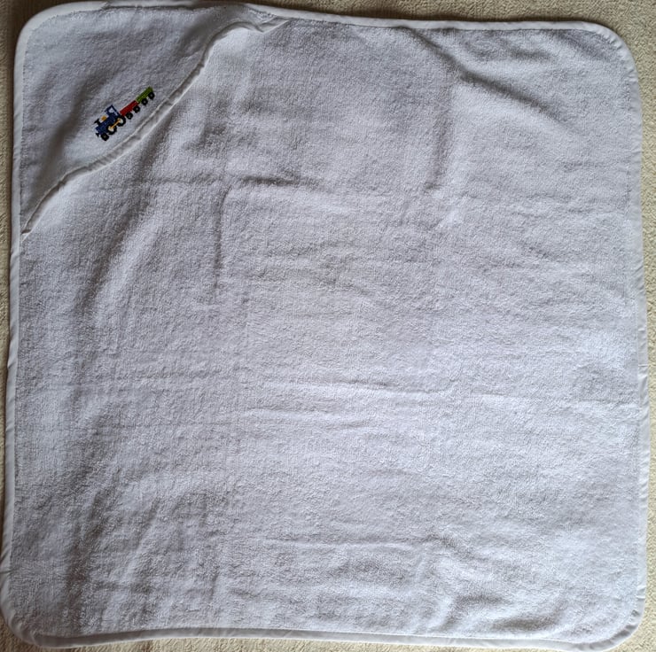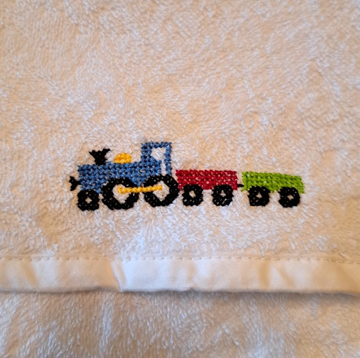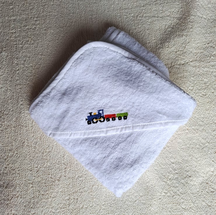 I have hand embroidered a toy train on the hood of this lovely soft white cotton baby towel. The engine is blue with a golden yellow dome and piston rod and is pulling two trucks, one red and one green. The towel measures 28" (71 cm.) square. It is machine washable.