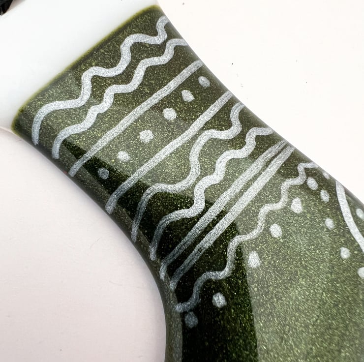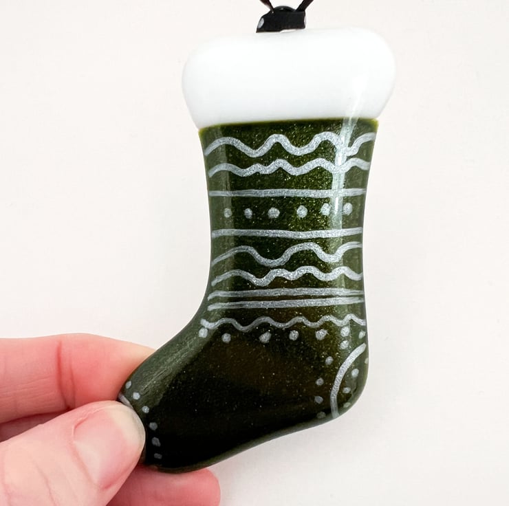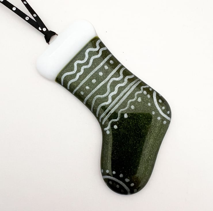 Fused glass hanging Christmas stocking decoration. Featuring hand painted decoration and a blue hanging ribbon. These Christmas decorations make wonderful small gifts and look lovely when hung on a Christmas tree.