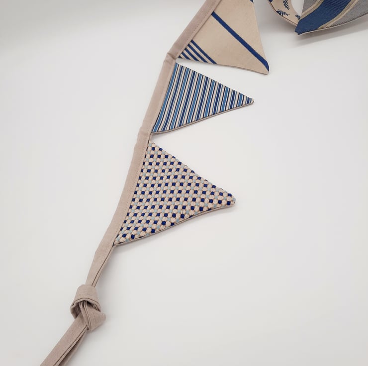 Mini bunting with 9 triangles of contrasting fabrics.