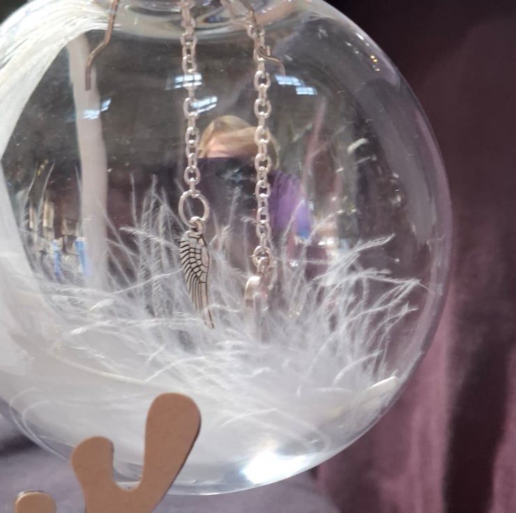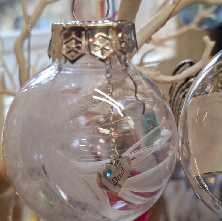 Clear acrylic bauble, white feathers and a heart charm. ( relation and gem stone)
