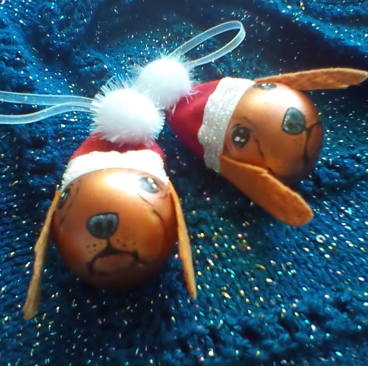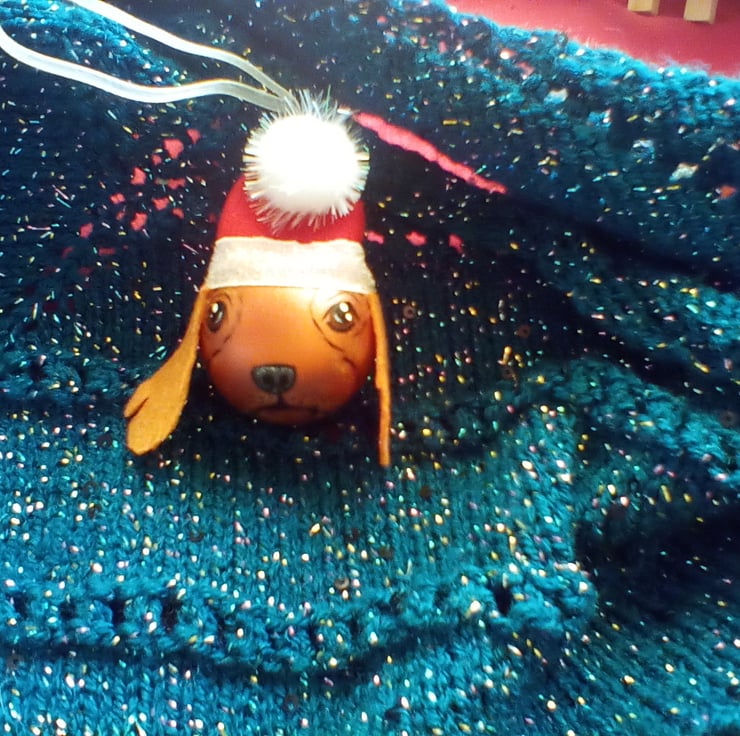 The dog wears a hand crafted mini Santa hat, which has a length of ribbon attached for hanging the decoration by.