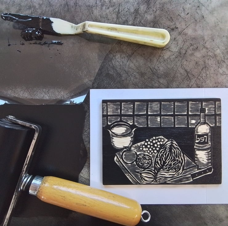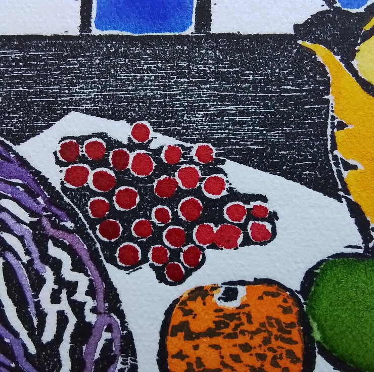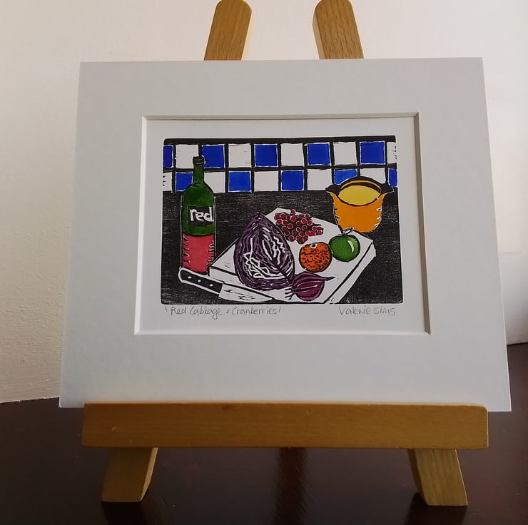 After printmaking and gardening, I also love creating in the kitchen. This hand-coloured woodcut shows the ingredients for Red Cabbage & Cranberries - a favourite Christmas and Winter side dish