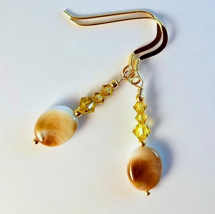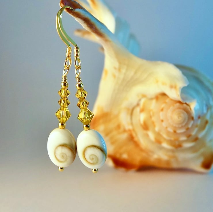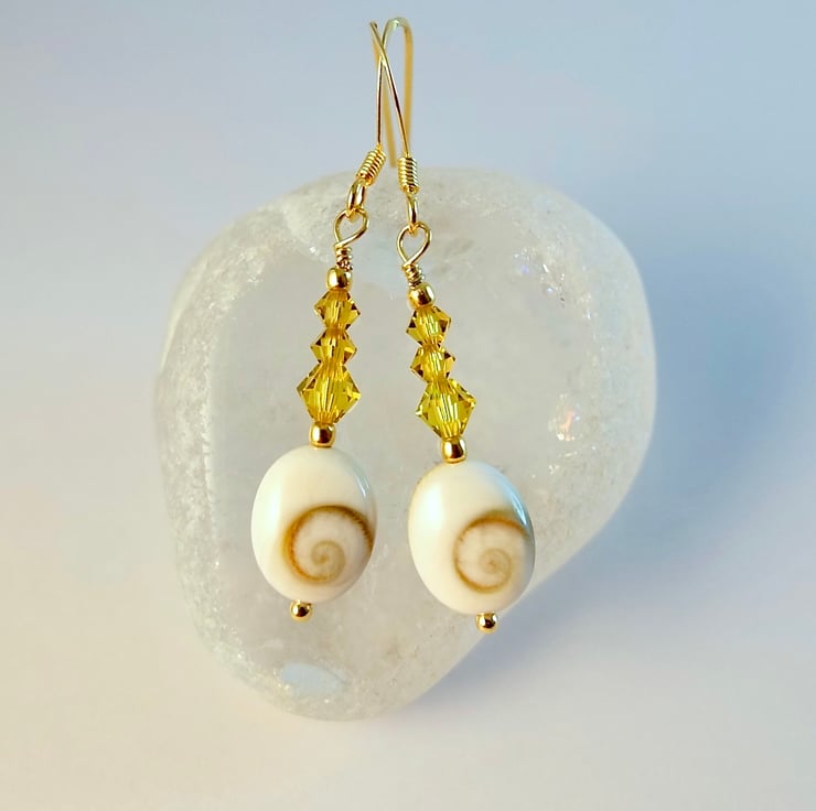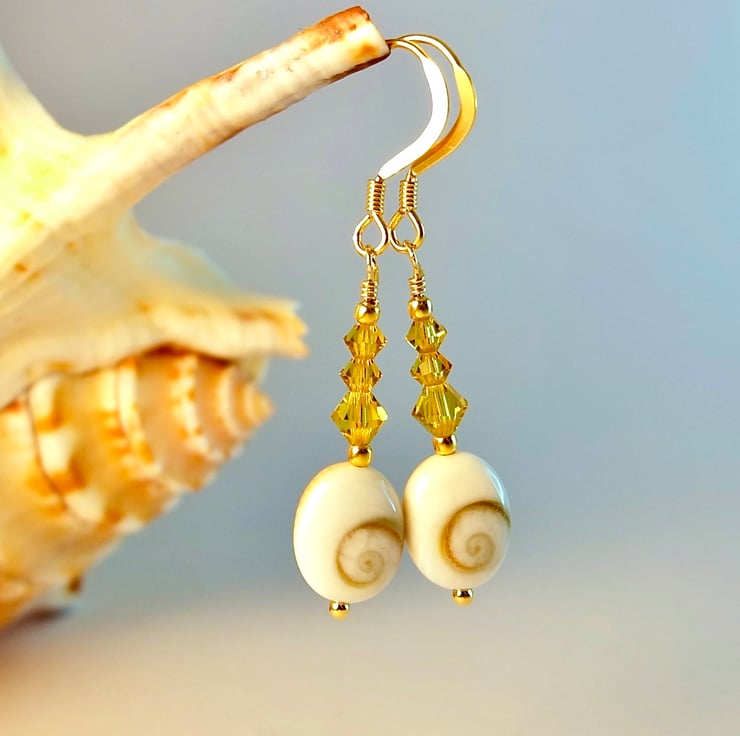 Each of these dainty drop earrings features a 10x8mm Shiva Eye Shell bead, topped with a trio of 4mm and 3mm yellow Austrian crystal bicones between a pair of 2mm gold vermeil beads.