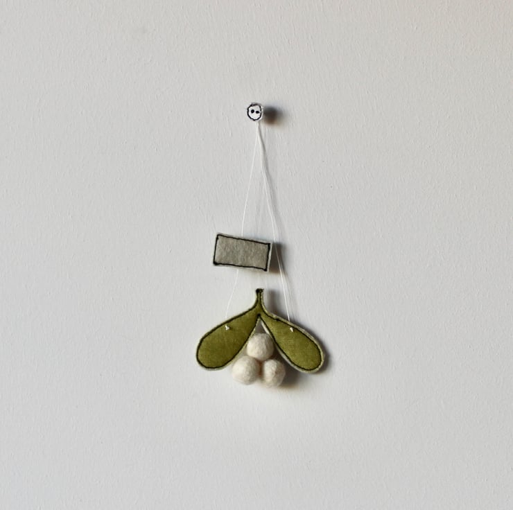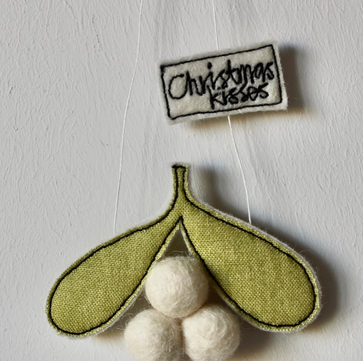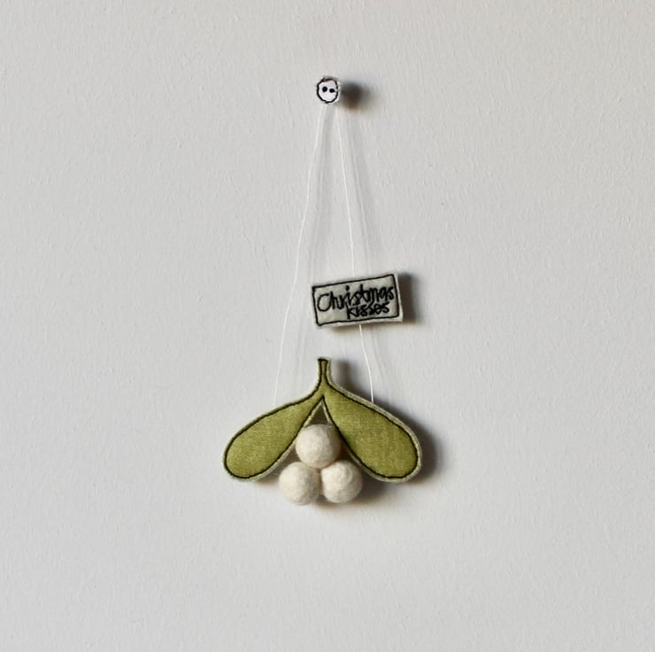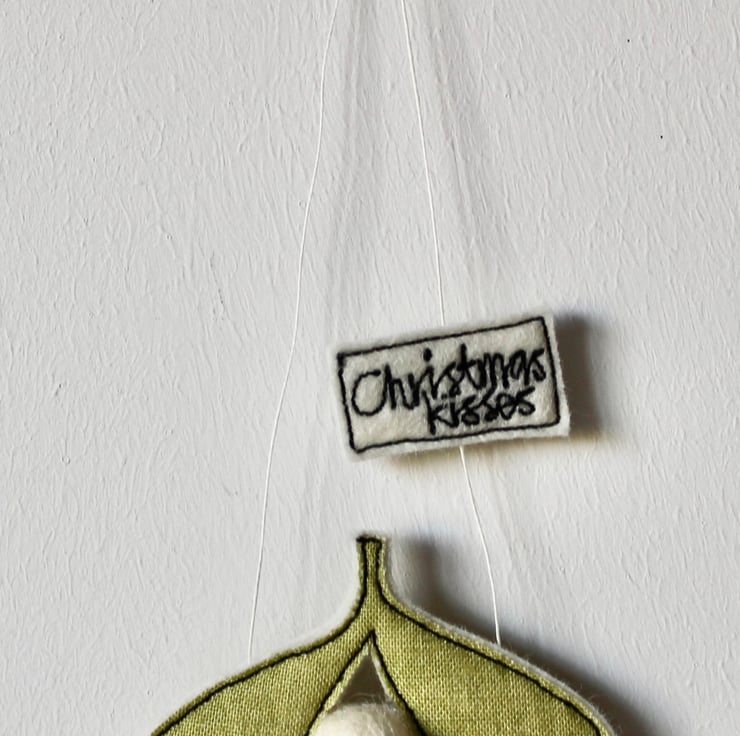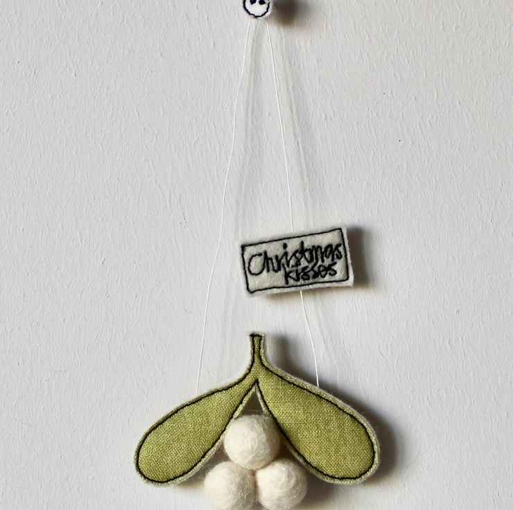Mistletoe is created using 100% wool felt, cotton cloth, free hand machine embroidery and is cut out by hand using very sharp scissors. Cream wool felt balls make perfect berries and a sewn label 'Christmas Kisses' is attached to the linen thread for hanging.