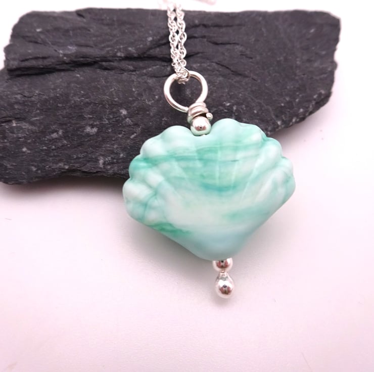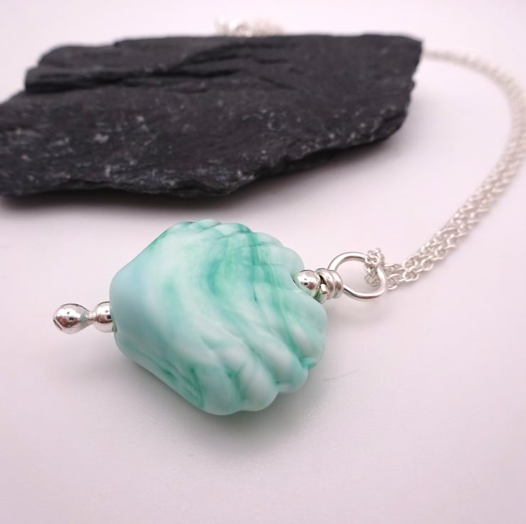 It features a sterling silver chain strung with a handmade lampwork glass green sea shell pendant.